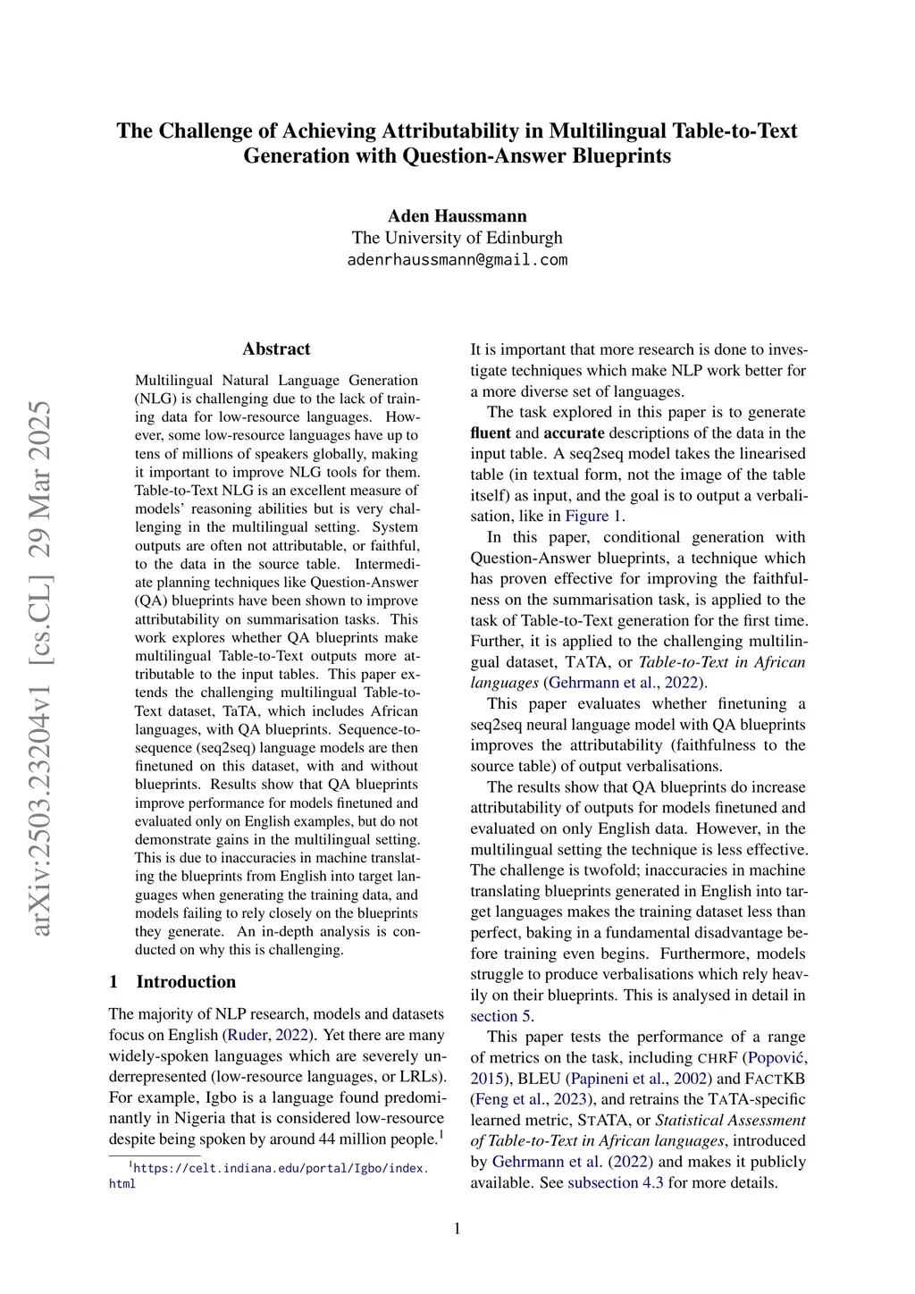 The Challenge of Achieving Attributability in Multilingual Table-to-Text Generation with Question-Answer Blueprints