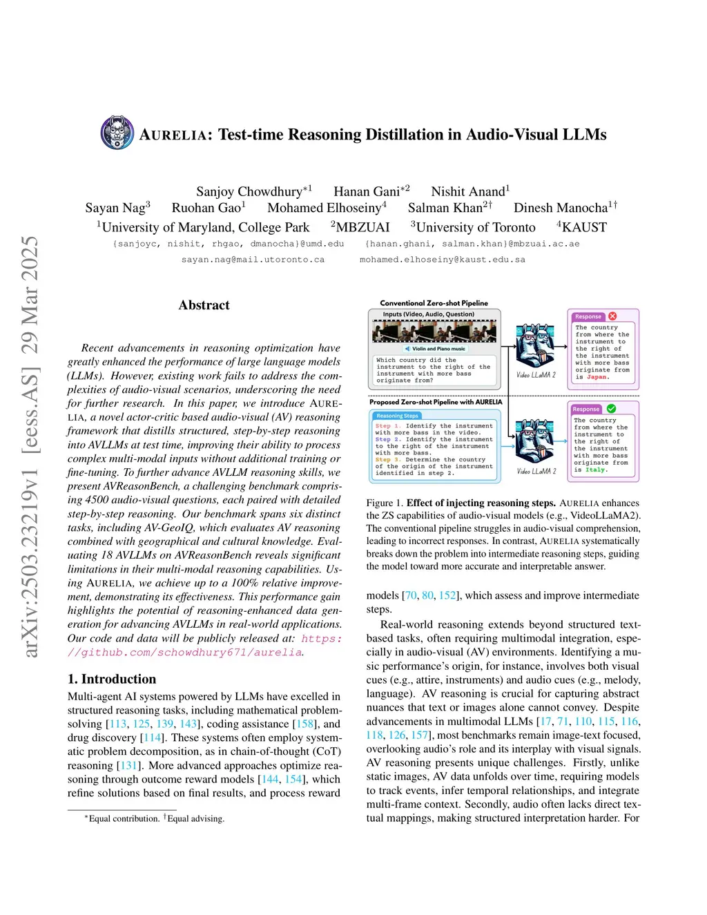 Recent advancements in reasoning optimization have greatly enhanced the performance of large language models (LLMs). However, existing work fails to address the complexities of audio-visual scenarios, underscoring the need for further research. In this paper, we introduce AURELIA, a novel actor-critic based audio-visual (AV) reasoning framework that distills structured, step-by-step reasoning into AVLLMs at test time, improving their ability to process complex multi-modal inputs without additional training or fine-tuning. To further advance AVLLM reasoning skills, we present AVReasonBench, a challenging benchmark comprising 4500 audio-visual questions, each paired with detailed step-by-step reasoning. Our benchmark spans six distinct tasks, including AV-GeoIQ, which evaluates AV reasoning combined with geographical and cultural knowledge. Evaluating 18 AVLLMs on AVReasonBench reveals significant limitations in their multi-modal reasoning capabilities. Using AURELIA, we achieve up to a 100% relative improvement, demonstrating its effectiveness. This performance gain highlights the potential of reasoning-enhanced data generation for advancing AVLLMs in real-world applications. Our code and data will be publicly released at: https: //github.com/schowdhury671/aurelia.