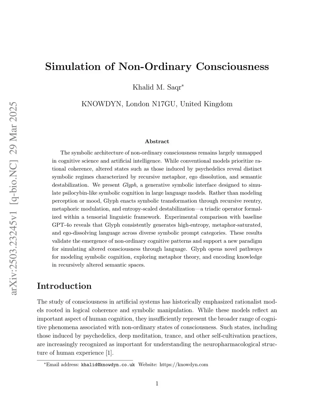 The symbolic architecture of non-ordinary consciousness remains largely unmapped in cognitive science and artificial intelligence. While conventional models prioritize rational coherence, altered states such as those induced by psychedelics reveal distinct symbolic regimes characterized by recursive metaphor, ego dissolution, and semantic destabilization. We present \textit{Glyph}, a generative symbolic interface designed to simulate psilocybin-like symbolic cognition in large language models. Rather than modeling perception or mood, Glyph enacts symbolic transformation through recursive reentry, metaphoric modulation, and entropy-scaled destabilization -- a triadic operator formalized within a tensorial linguistic framework. Experimental comparison with baseline GPT-4o reveals that Glyph consistently generates high-entropy, metaphor-saturated, and ego-dissolving language across diverse symbolic prompt categories. These results validate the emergence of non-ordinary cognitive patterns and support a new paradigm for simulating altered consciousness through language. Glyph opens novel pathways for modeling symbolic cognition, exploring metaphor theory, and encoding knowledge in recursively altered semantic spaces.