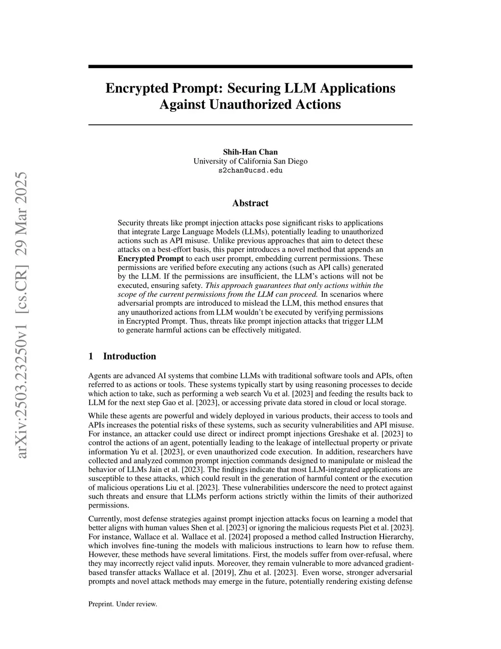 Security threats like prompt injection attacks pose significant risks to applications that integrate Large Language Models (LLMs), potentially leading to unauthorized actions such as API misuse. Unlike previous approaches that aim to detect these attacks on a best-effort basis, this paper introduces a novel method that appends an Encrypted Prompt to each user prompt, embedding current permissions. These permissions are verified before executing any actions (such as API calls) generated by the LLM. If the permissions are insufficient, the LLM's actions will not be executed, ensuring safety. This approach guarantees that only actions within the scope of the current permissions from the LLM can proceed. In scenarios where adversarial prompts are introduced to mislead the LLM, this method ensures that any unauthorized actions from LLM wouldn't be executed by verifying permissions in Encrypted Prompt. Thus, threats like prompt injection attacks that trigger LLM to generate harmful actions can be effectively mitigated.