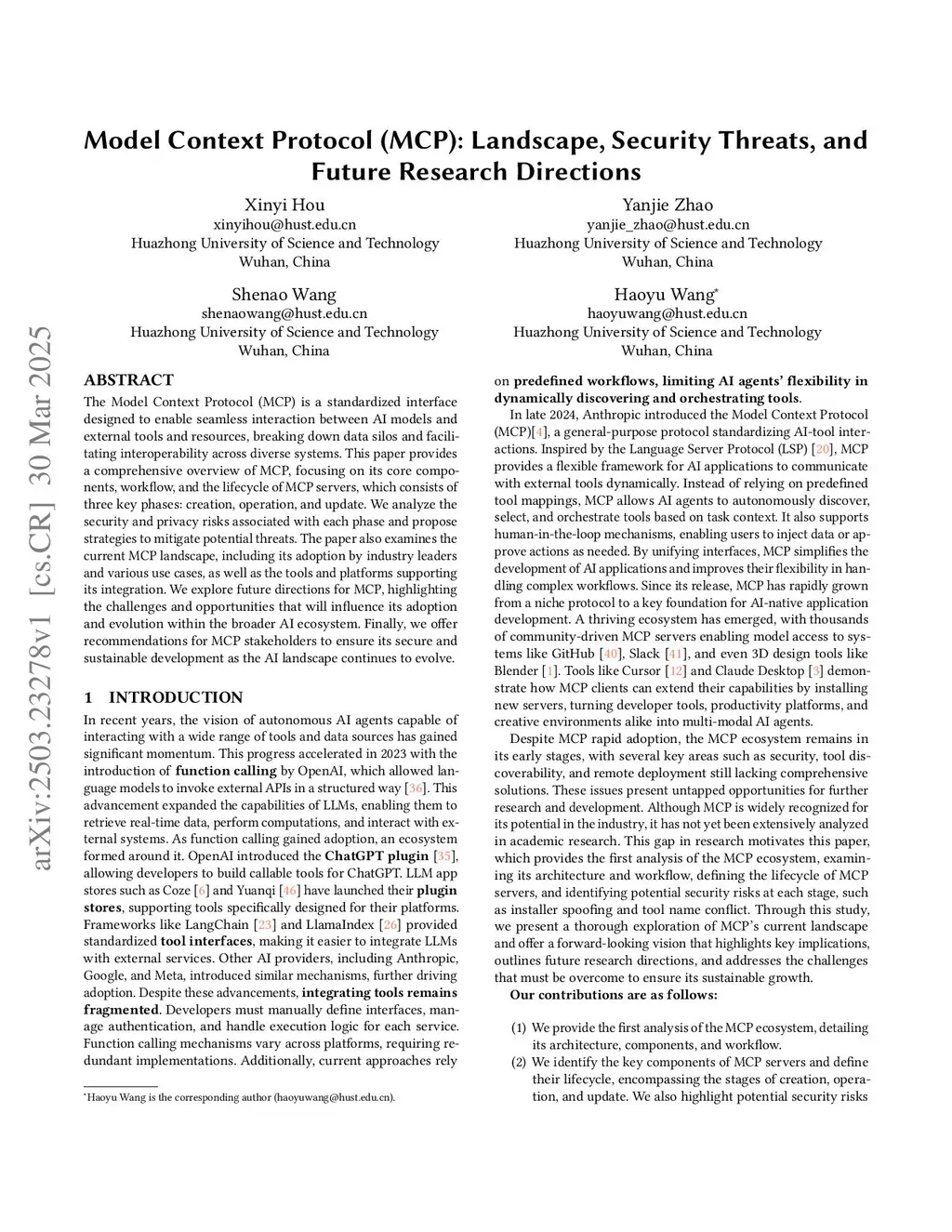Model Context Protocol (MCP): Landscape, Security Threats, and Future Research Directions