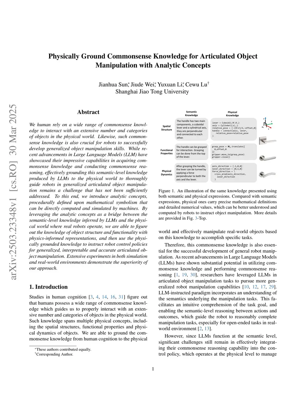 We human rely on a wide range of commonsense knowledge to interact with an extensive number and categories of objects in the physical world. Likewise, such commonsense knowledge is also crucial for robots to successfully develop generalized object manipulation skills. While recent advancements in Large Language Models (LLM) have showcased their impressive capabilities in acquiring commonsense knowledge and conducting commonsense reasoning, effectively grounding this semantic-level knowledge produced by LLMs to the physical world to thoroughly guide robots in generalized articulated object manipulation remains a challenge that has not been sufficiently addressed. To this end, we introduce analytic concepts, procedurally defined upon mathematical symbolism that can be directly computed and simulated by machines. By leveraging the analytic concepts as a bridge between the semantic-level knowledge inferred by LLMs and the physical world where real robots operate, we are able to figure out the knowledge of object structure and functionality with physics-informed representations, and then use the physically grounded knowledge to instruct robot control policies for generalized, interpretable and accurate articulated object manipulation. Extensive experiments in both simulation and real-world environments demonstrate the superiority of our approach.