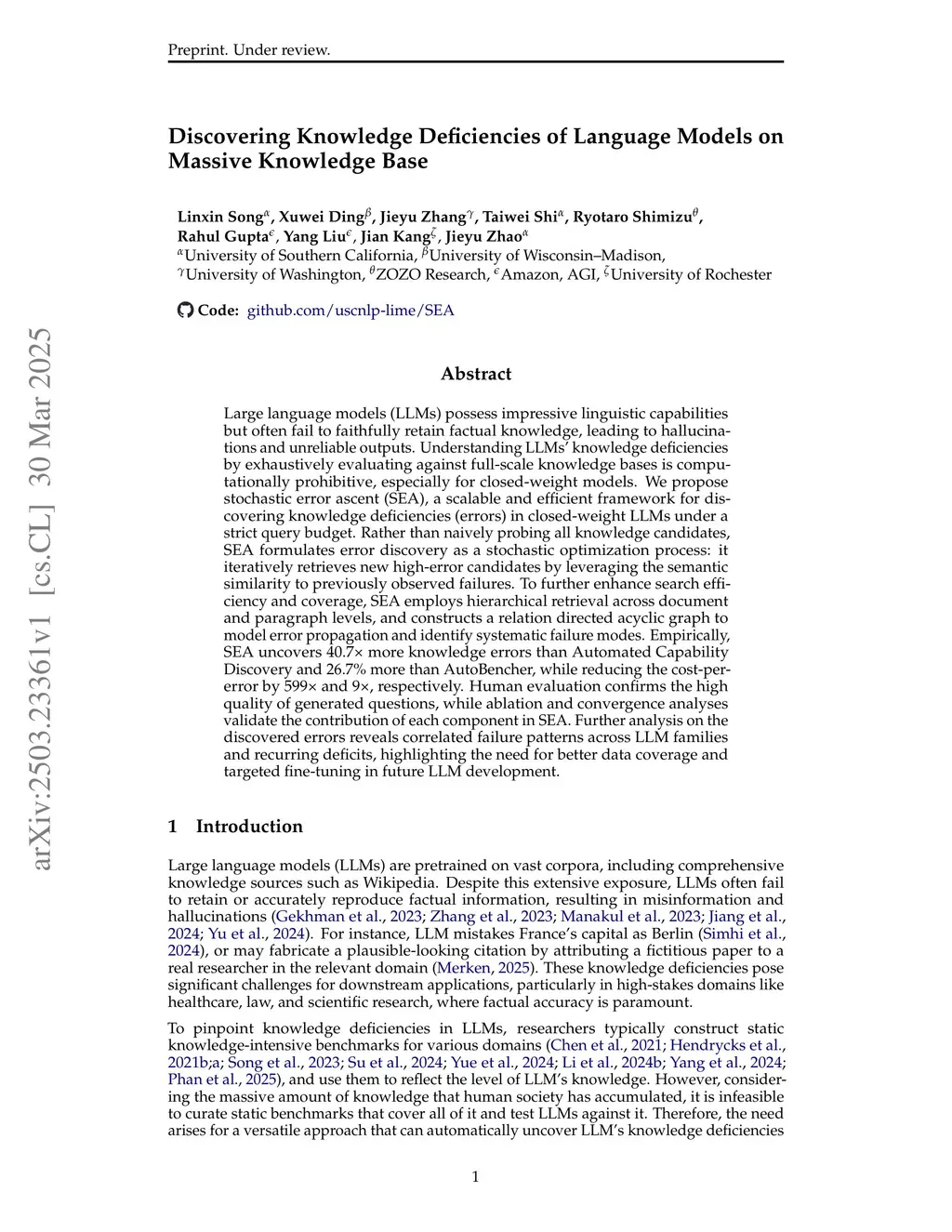 Large language models (LLMs) possess impressive linguistic capabilities but often fail to faithfully retain factual knowledge, leading to hallucinations and unreliable outputs. Understanding LLMs' knowledge deficiencies by exhaustively evaluating against full-scale knowledge bases is computationally prohibitive, especially for closed-weight models. We propose stochastic error ascent (SEA), a scalable and efficient framework for discovering knowledge deficiencies (errors) in closed-weight LLMs under a strict query budget. Rather than naively probing all knowledge candidates, SEA formulates error discovery as a stochastic optimization process: it iteratively retrieves new high-error candidates by leveraging the semantic similarity to previously observed failures. To further enhance search efficiency and coverage, SEA employs hierarchical retrieval across document and paragraph levels, and constructs a relation directed acyclic graph to model error propagation and identify systematic failure modes. Empirically, SEA uncovers 40.7x more knowledge errors than Automated Capability Discovery and 26.7% more than AutoBencher, while reducing the cost-per-error by 599x and 9x, respectively. Human evaluation confirms the high quality of generated questions, while ablation and convergence analyses validate the contribution of each component in SEA. Further analysis on the discovered errors reveals correlated failure patterns across LLM families and recurring deficits, highlighting the need for better data coverage and targeted fine-tuning in future LLM development.