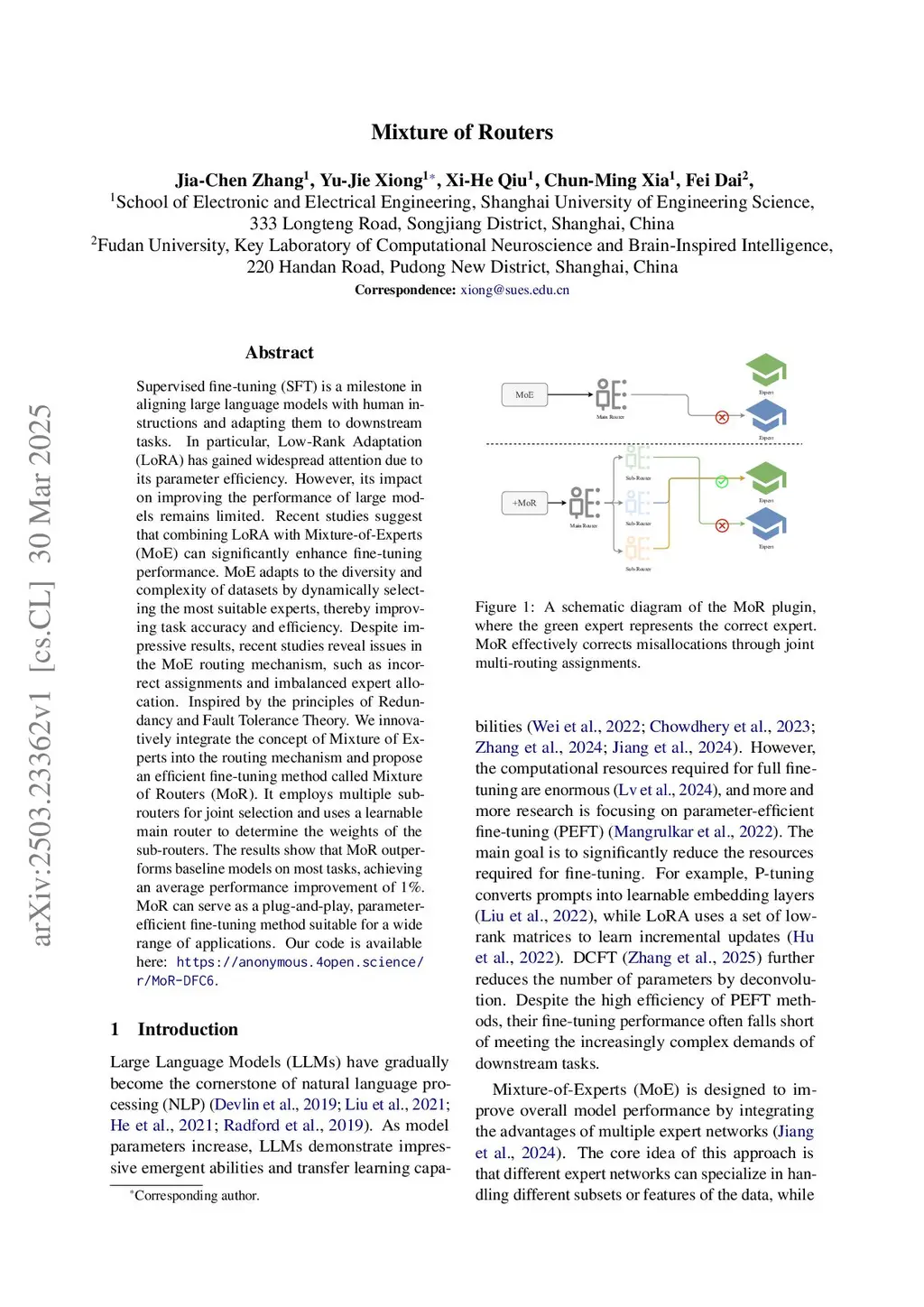 Supervised fine-tuning (SFT) is a milestone in aligning large language models with human instructions and adapting them to downstream tasks. In particular, Low-Rank Adaptation (LoRA) has gained widespread attention due to its parameter efficiency. However, its impact on improving the performance of large models remains limited. Recent studies suggest that combining LoRA with Mixture-of-Experts (MoE) can significantly enhance fine-tuning performance. MoE adapts to the diversity and complexity of datasets by dynamically selecting the most suitable experts, thereby improving task accuracy and efficiency. Despite impressive results, recent studies reveal issues in the MoE routing mechanism, such as incorrect assignments and imbalanced expert allocation. Inspired by the principles of Redundancy and Fault Tolerance Theory. We innovatively integrate the concept of Mixture of Experts into the routing mechanism and propose an efficient fine-tuning method called Mixture of Routers (MoR). It employs multiple sub-routers for joint selection and uses a learnable main router to determine the weights of the sub-routers. The results show that MoR outperforms baseline models on most tasks, achieving an average performance improvement of 1%. MoR can serve as a plug-and-play, parameter-efficient fine-tuning method suitable for a wide range of applications. Our code is available here:this https URL.