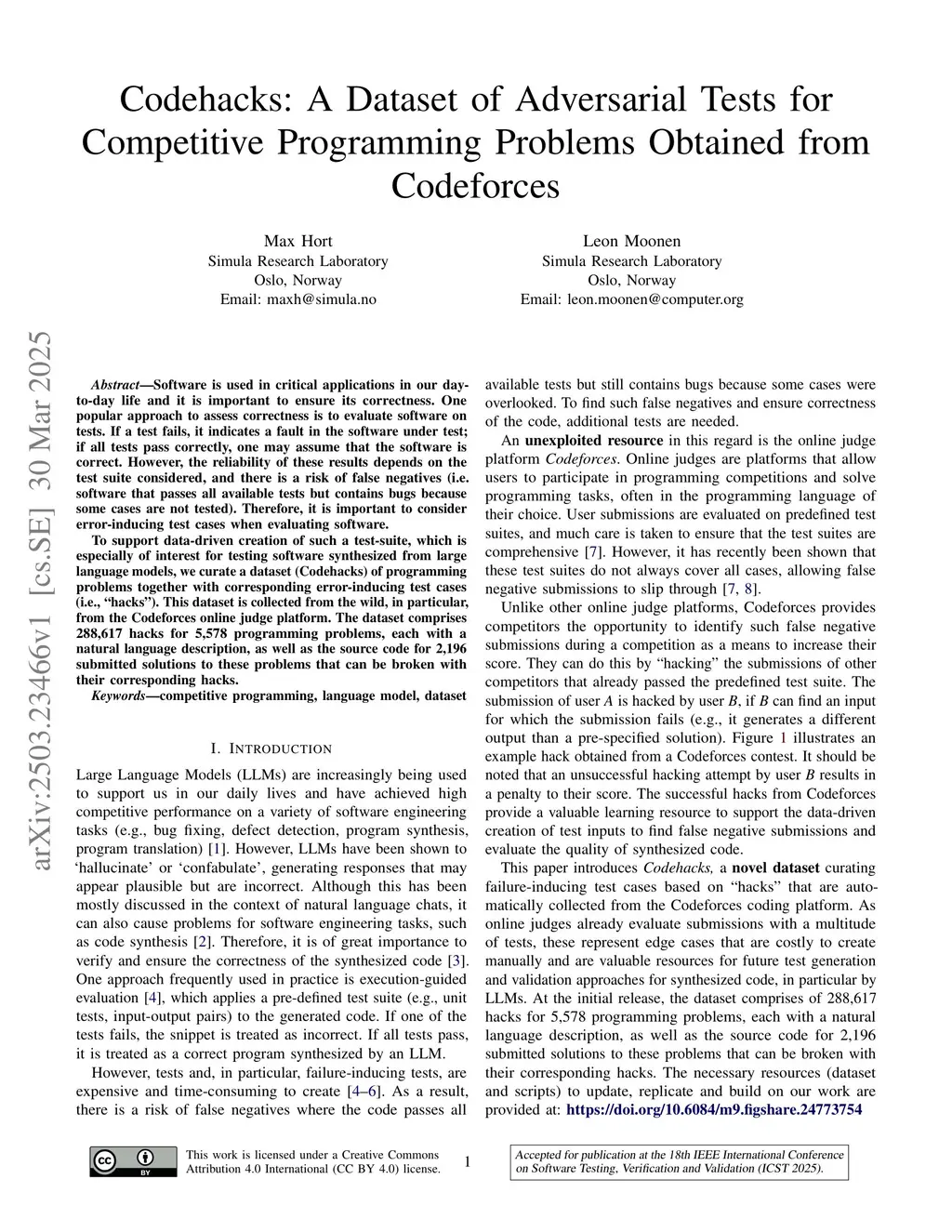 Software is used in critical applications in our day-to-day life and it is important to ensure its correctness. One popular approach to assess correctness is to evaluate software on tests. If a test fails, it indicates a fault in the software under test; if all tests pass correctly, one may assume that the software is correct. However, the reliability of these results depends on the test suite considered, and there is a risk of false negatives (i.e. software that passes all available tests but contains bugs because some cases are not tested). Therefore, it is important to consider error-inducing test cases when evaluating software.To support data-driven creation of such a test-suite, which is especially of interest for testing software synthesized from large language models, we curate a dataset (Codehacks) of programming problems together with corresponding error-inducing test cases (i.e., "hacks"). This dataset is collected from the wild, in particular, from the Codeforces online judge platform. The dataset comprises 288,617 hacks for 5,578 programming problems, each with a natural language description, as well as the source code for 2,196 submitted solutions to these problems that can be broken with their corresponding hacks.Keywords: competitive programming, language model, dataset