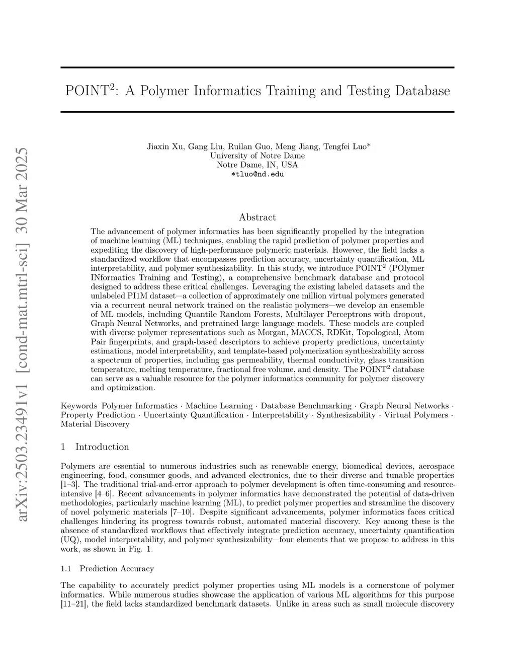 The advancement of polymer informatics has been significantly propelled by the integration of machine learning (ML) techniques, enabling the rapid prediction of polymer properties and expediting the discovery of high-performance polymeric materials. However, the field lacks a standardized workflow that encompasses prediction accuracy, uncertainty quantification, ML interpretability, and polymer synthesizability. In this study, we introduce POINT (POlymer INformatics Training and Testing), a comprehensive benchmark database and protocol designed to address these critical challenges. Leveraging the existing labeled datasets and the unlabeled PI1M dataset, a collection of approximately one million virtual polymers generated via a recurrent neural network trained on the realistic polymers, we develop an ensemble of ML models, including Quantile Random Forests, Multilayer Perceptrons with dropout, Graph Neural Networks, and pretrained large language models. These models are coupled with diverse polymer representations such as Morgan, MACCS, RDKit, Topological, Atom Pair fingerprints, and graph-based descriptors to achieve property predictions, uncertainty estimations, model interpretability, and template-based polymerization synthesizability across a spectrum of properties, including gas permeability, thermal conductivity, glass transition temperature, melting temperature, fractional free volume, and density. The POINT database can serve as a valuable resource for the polymer informatics community for polymer discovery and optimization.