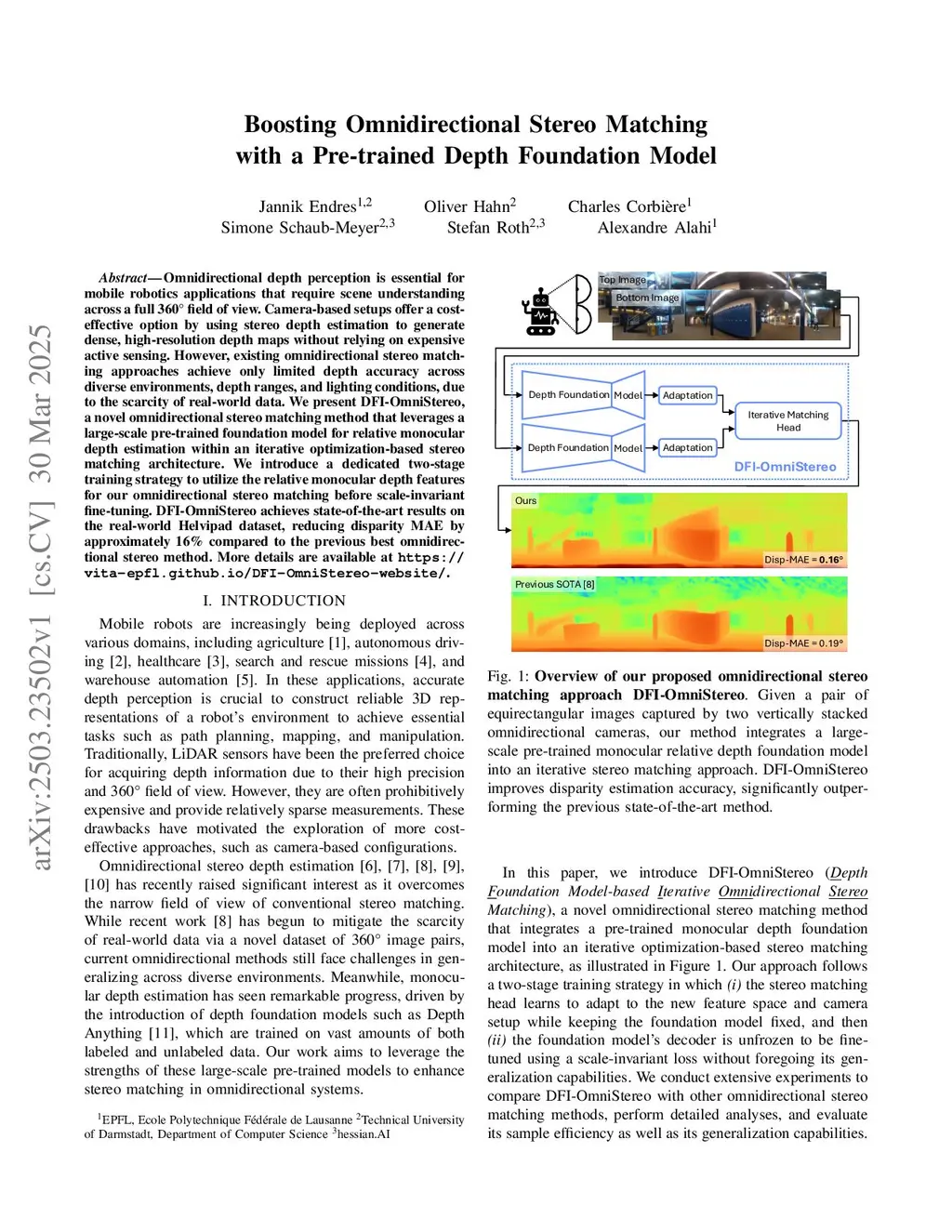 Omnidirectional depth perception is essential for mobile robotics applications that require scene understanding across a full 360° field of view. Camera-based setups offer a cost-effective option by using stereo depth estimation to generate dense, high-resolution depth maps without relying on expensive active sensing. However, existing omnidirectional stereo matching approaches achieve only limited depth accuracy across diverse environments, depth ranges, and lighting conditions, due to the scarcity of real-world data. We present DFI-OmniStereo, a novel omnidirectional stereo matching method that leverages a large-scale pre-trained foundation model for relative monocular depth estimation within an iterative optimization-based stereo matching architecture. We introduce a dedicated two-stage training strategy to utilize the relative monocular depth features for our omnidirectional stereo matching before scale-invariant fine-tuning. DFI-OmniStereo achieves state-of-the-art results on the real-world Helvipad dataset, reducing disparity MAE by approximately 16% compared to the previous best omnidirectional stereo method.