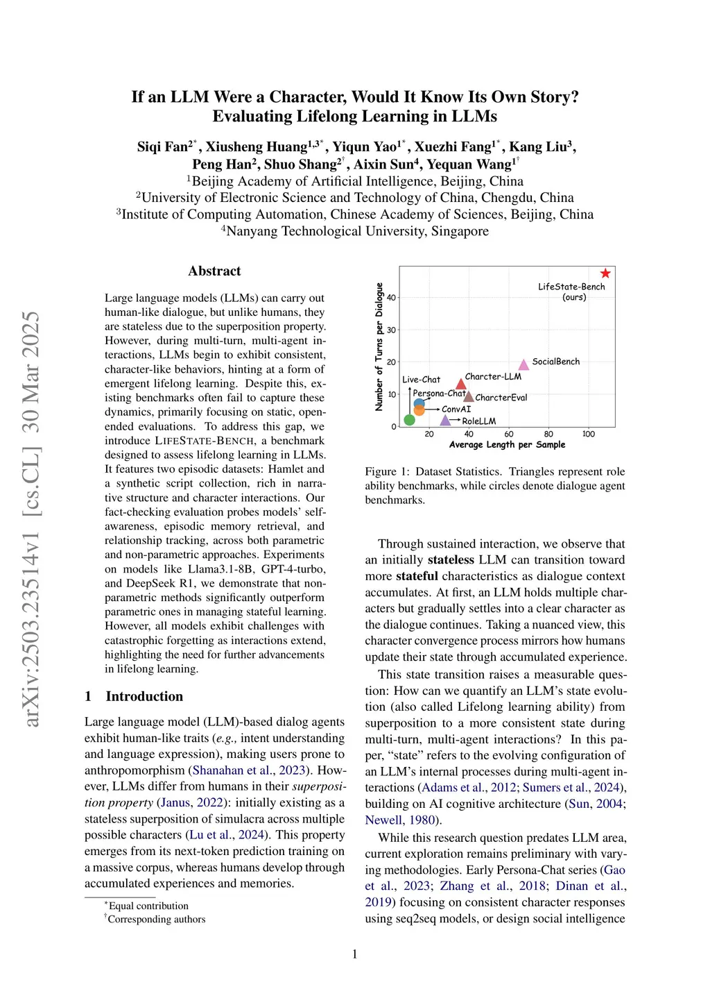 Large language models (LLMs) can carry out human-like dialogue, but unlike humans, they are stateless due to the superposition property. However, during multi-turn, multi-agent interactions, LLMs begin to exhibit consistent, character-like behaviors, hinting at a form of emergent lifelong learning. Despite this, existing benchmarks often fail to capture these dynamics, primarily focusing on static, open-ended evaluations. To address this gap, we introduce LIFESTATE-BENCH, a benchmark designed to assess lifelong learning in LLMs. It features two episodic datasets: Hamlet and a synthetic script collection, rich in narrative structure and character interactions. Our fact checking evaluation probes models' self-awareness, episodic memory retrieval, and relationship tracking, across both parametric and non-parametric approaches. Experiments on models like Llama3.1-8B, GPT-4-turbo, and DeepSeek R1, we demonstrate that nonparametric methods significantly outperform parametric ones in managing stateful learning. However, all models exhibit challenges with catastrophic forgetting as interactions extend, highlighting the need for further advancements in lifelong learning.