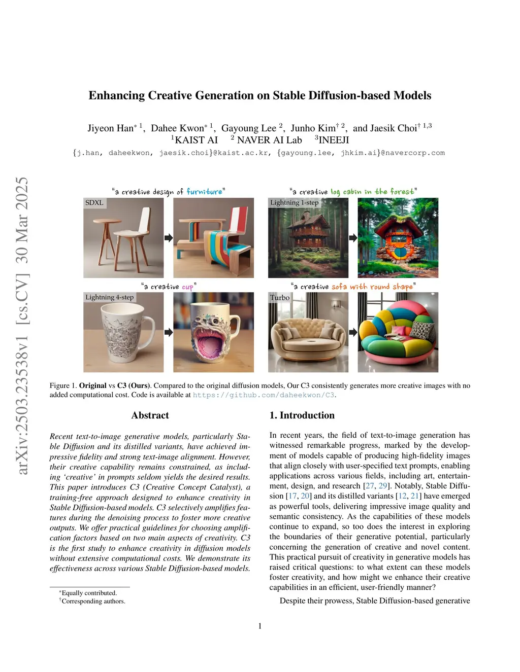 Recent text-to-image generative models, particularly Stable Diffusion and its distilled variants, have achieved impressive fidelity and strong text-image alignment. However, their creative capability remains constrained, as including `creative' in prompts seldom yields the desired results. This paper introduces C3 (Creative Concept Catalyst), a training-free approach designed to enhance creativity in Stable Diffusion-based models. C3 selectively amplifies features during the denoising process to foster more creative outputs. We offer practical guidelines for choosing amplification factors based on two main aspects of creativity. C3 is the first study to enhance creativity in diffusion models without extensive computational costs. We demonstrate its effectiveness across various Stable Diffusion-based models.