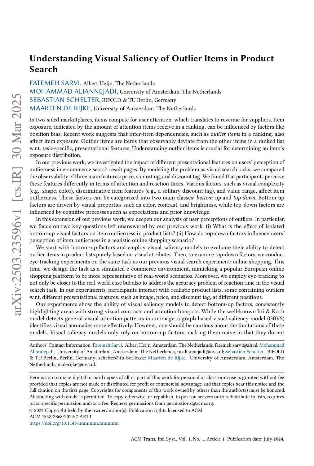 In two-sided marketplaces, items compete for user attention, which translates to revenue for suppliers. Item exposure, indicated by the amount of attention items receive in a ranking, can be influenced by factors like position bias. Recent work suggests that inter-item dependencies, such as outlier items in a ranking, also affect item exposure. Outlier items are items that observably deviate from the other items in a ranked list. Understanding outlier items is crucial for determining an item's exposure distribution. In our previous work, we investigated the impact of different presentational features on users' perception of outlier in search results. In this work, we focus on two key questions left unanswered by our previous work: (i) What is the effect of isolated bottom-up visual factors on item outlierness in product lists? (ii) How do top-down factors influence users' perception of item outlierness in a realistic online shopping scenario? We start with bottom-up factors and employ visual saliency models to evaluate their ability to detect outlier items in product lists purely based on visual attributes. Then, to examine top-down factors, we conduct eye-tracking experiments on an online shopping task. Moreover, we employ eye-tracking to not only be closer to the real-world case but also to address the accuracy problem of reaction time in the visual search task. Our experiments show the ability of visual saliency models to detect bottom-up factors, consistently highlighting areas with strong visual contrasts. The results of our eye-tracking experiment for lists without outliers show that despite being less visually attractive, product descriptions captured attention the fastest, indicating the importance of top-down factors. In our eye-tracking experiments, we observed that outlier items engaged users for longer durations compared to non-outlier items.