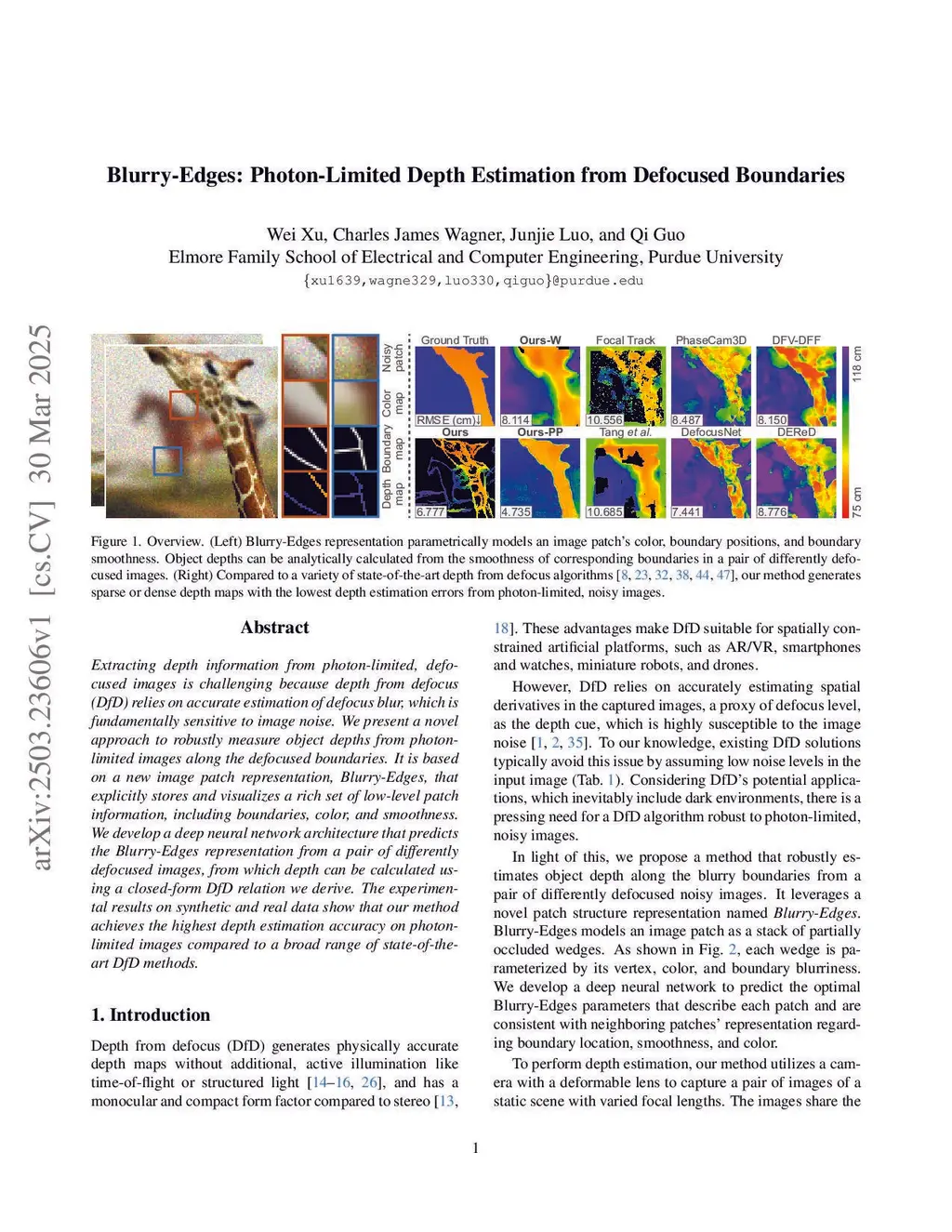 Extracting depth information from photon-limited, defocused images is challenging because depth from defocus (DfD) relies on accurate estimation of defocus blur, which is fundamentally sensitive to image noise. We present a novel approach to robustly measure object depths from photon-limited images along the defocused boundaries. It is based on a new image patch representation, Blurry-Edges, that explicitly stores and visualizes a rich set of low-level patch information, including boundaries, color, and smoothness. We develop a deep neural network architecture that predicts the Blurry-Edges representation from a pair of differently defocused images, from which depth can be calculated using a closed-form DfD relation we derive. The experimental results on synthetic and real data show that our method achieves the highest depth estimation accuracy on photon-limited images compared to a broad range of state-of-the-art DfD methods.
