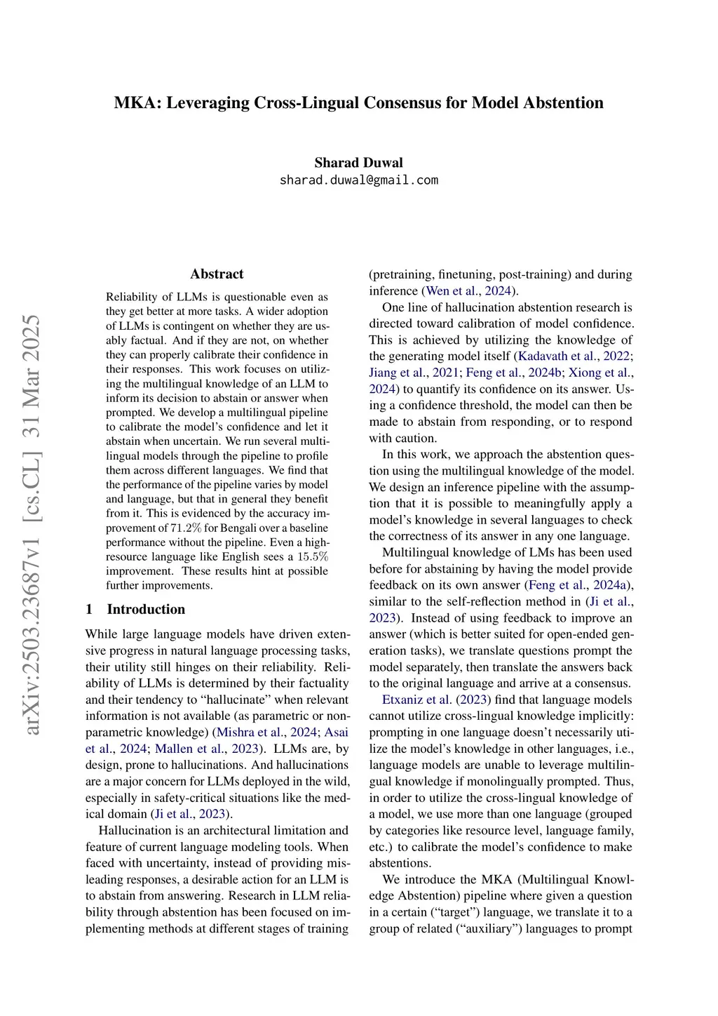 Reliability of LLMs is questionable even as they get better at more tasks. A wider adoption of LLMs is contingent on whether they are usably factual. And if they are not, on whether they can properly calibrate their confidence in their responses. This work focuses on utilizing the multilingual knowledge of an LLM to inform its decision to abstain or answer when prompted. We develop a multilingual pipeline to calibrate the model's confidence and let it abstain when uncertain. We run several multilingual models through the pipeline to profile them across different languages. We find that the performance of the pipeline varies by model and language, but that in general they benefit from it. This is evidenced by the accuracy improvement of for Bengali over a baseline performance without the pipeline. Even a high-resource language like English sees a improvement. These results hint at possible further improvements.