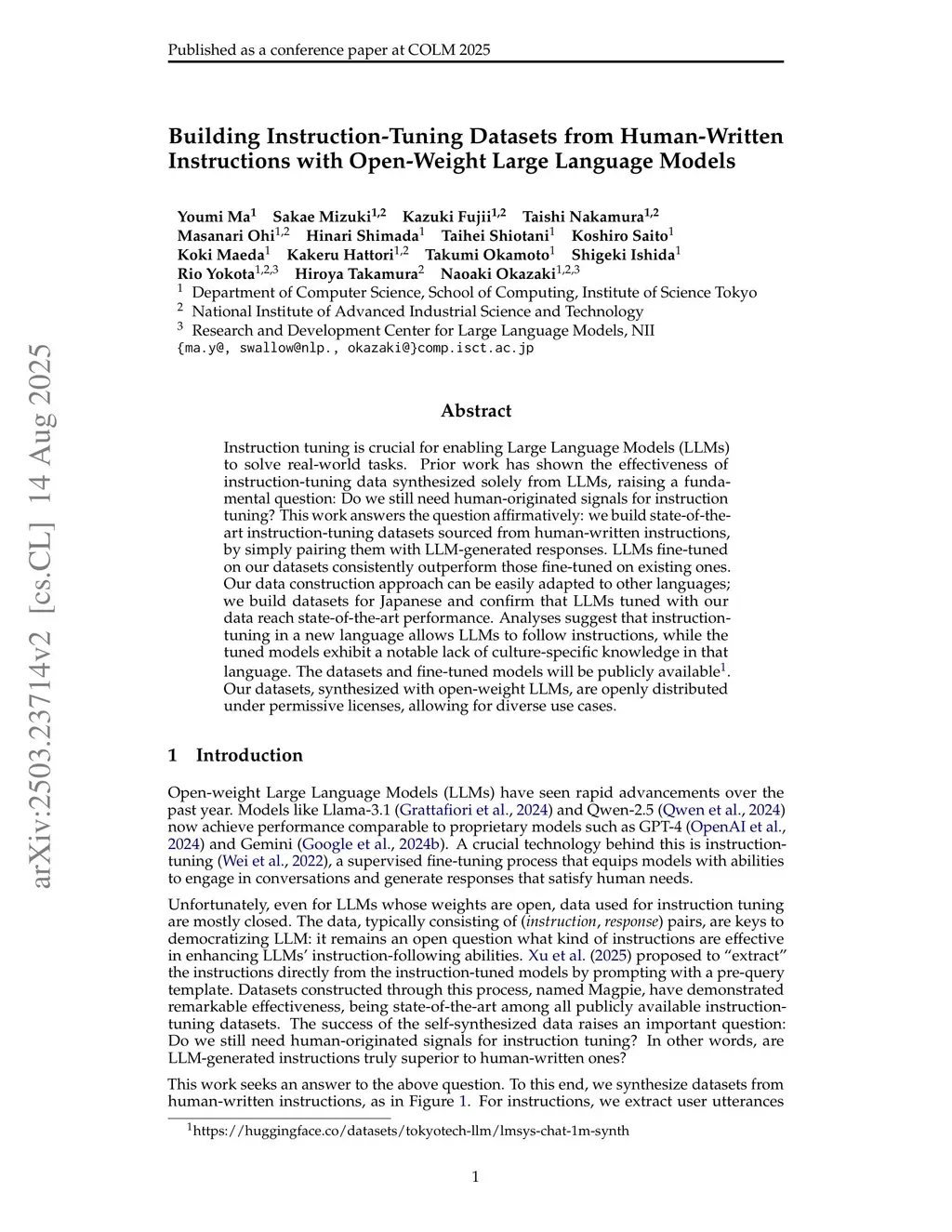 Building Instruction-Tuning Datasets from Human-Written Instructions with Open-Weight Large Language Models