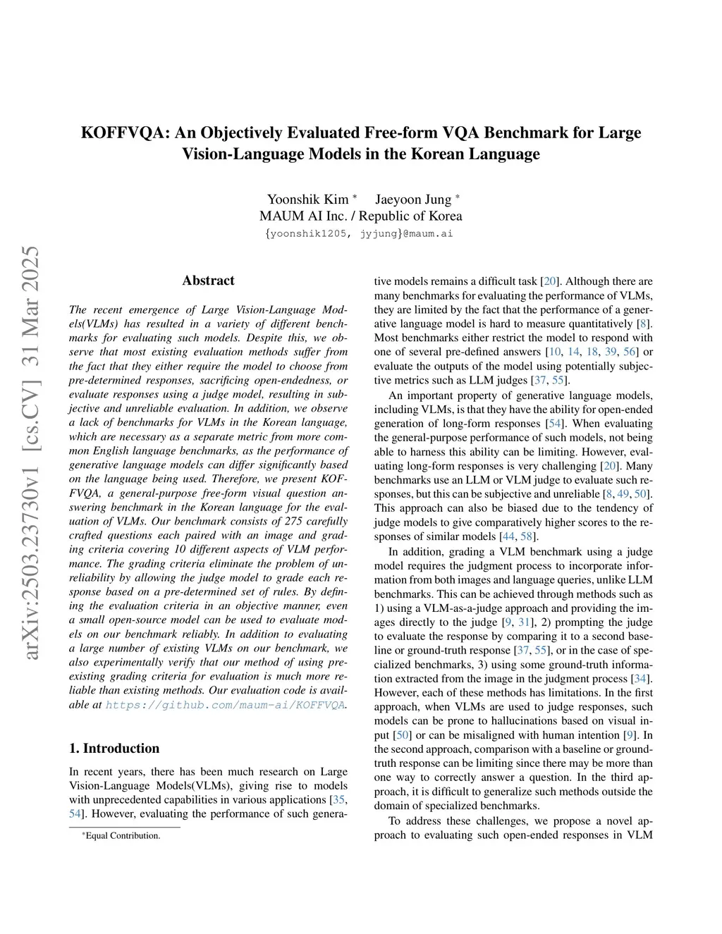 The recent emergence of Large Vision-Language Models(VLMs) has resulted in a variety of different benchmarks for evaluating such models. Despite this, we observe that most existing evaluation methods suffer from the fact that they either require the model to choose from pre-determined responses, sacrificing open-endedness, or evaluate responses using a judge model, resulting in subjective and unreliable evaluation. In addition, we observe a lack of benchmarks for VLMs in the Korean language, which are necessary as a separate metric from more common English language benchmarks, as the performance of generative language models can differ significantly based on the language being used. Therefore, we present KOFFVQA, a general-purpose free-form visual question answering benchmark in the Korean language for the evaluation of VLMs. Our benchmark consists of 275 carefully crafted questions each paired with an image and grading criteria covering 10 different aspects of VLM performance. The grading criteria eliminate the problem of unreliability by allowing the judge model to grade each response based on a pre-determined set of rules. By defining the evaluation criteria in an objective manner, even a small open-source model can be used to evaluate models on our benchmark reliably. In addition to evaluating a large number of existing VLMs on our benchmark, we also experimentally verify that our method of using pre-existing grading criteria for evaluation is much more reliable than existing methods. Our evaluation code is available atthis https URL