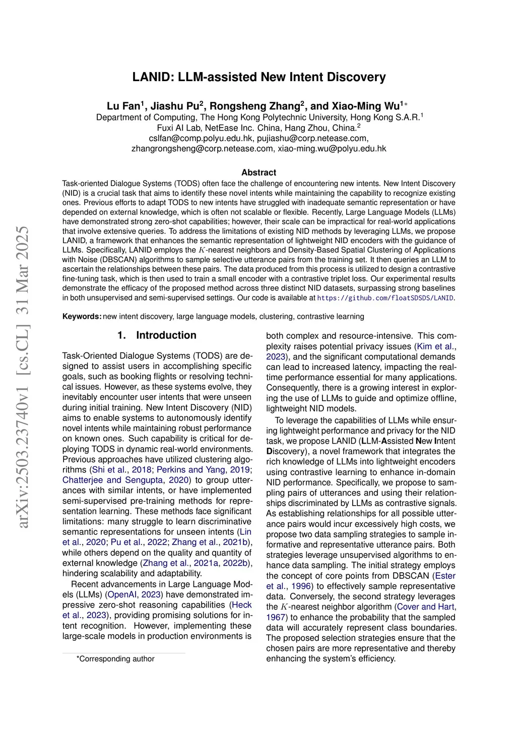 Task-oriented Dialogue Systems (TODS) often face the challenge of encountering new intents. New Intent Discovery (NID) is a crucial task that aims to identify these novel intents while maintaining the capability to recognize existing ones. Previous efforts to adapt TODS to new intents have struggled with inadequate semantic representation or have depended on external knowledge, which is often not scalable or flexible. Recently, Large Language Models (LLMs) have demonstrated strong zero-shot capabilities; however, their scale can be impractical for real-world applications that involve extensive queries. To address the limitations of existing NID methods by leveraging LLMs, we propose LANID, a framework that enhances the semantic representation of lightweight NID encoders with the guidance of LLMs. Specifically, LANID employs the -nearest neighbors and Density-Based Spatial Clustering of Applications with Noise (DBSCAN) algorithms to sample selective utterance pairs from the training set. It then queries an LLM to ascertain the relationships between these pairs. The data produced from this process is utilized to design a contrastive fine-tuning task, which is then used to train a small encoder with a contrastive triplet loss. Our experimental results demonstrate the efficacy of the proposed method across three distinct NID datasets, surpassing strong baselines in both unsupervised and semi-supervised settings. Our code is available atthis https URL.