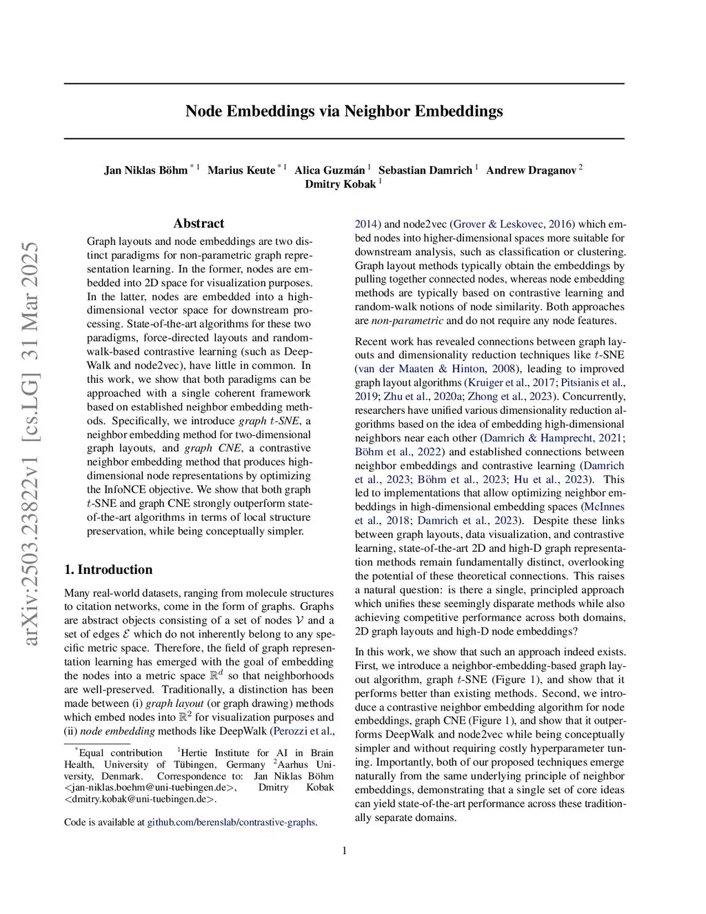 Node embeddings are a paradigm in non-parametric graph representation learning, where graph nodes are embedded into a given vector space to enable downstream processing. State-of-the-art node-embedding algorithms, such as DeepWalk and node2vec, are based on random-walk notions of node similarity and on contrastive learning. In this work, we introduce the graph neighbor-embedding (graph NE) framework that directly pulls together embedding vectors of adjacent nodes without relying on any random walks. We show that graph NE strongly outperforms state-of-the-art node-embedding algorithms in terms of local structure preservation. Furthermore, we apply graph NE to the 2D node-embedding problem, obtaining graph t-SNE layouts that also outperform existing graph-layout algorithms.