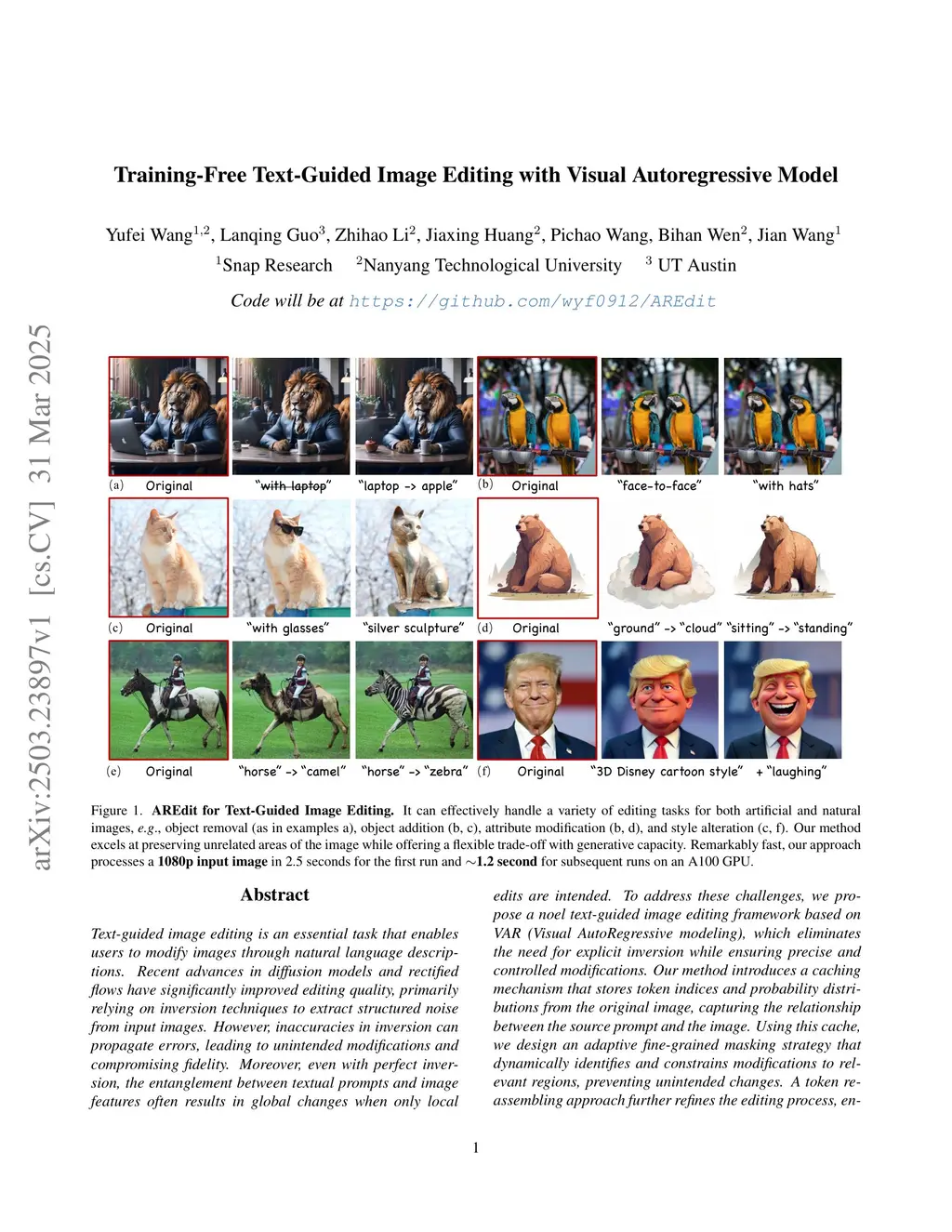 Text-guided image editing is an essential task that enables users to modify images through natural language descriptions. Recent advances in diffusion models and rectified flows have significantly improved editing quality, primarily relying on inversion techniques to extract structured noise from input images. However, inaccuracies in inversion can propagate errors, leading to unintended modifications and compromising fidelity. Moreover, even with perfect inversion, the entanglement between textual prompts and image features often results in global changes when only local edits are intended. To address these challenges, we propose a novel text-guided image editing framework based on VAR (Visual AutoRegressive modeling), which eliminates the need for explicit inversion while ensuring precise and controlled modifications. Our method introduces a caching mechanism that stores token indices and probability distributions from the original image, capturing the relationship between the source prompt and the image. Using this cache, we design an adaptive fine-grained masking strategy that dynamically identifies and constrains modifications to relevant regions, preventing unintended changes. A token reassembling approach further refines the editing process, enhancing diversity, fidelity, and control. Our framework operates in a training-free manner and achieves high-fidelity editing with faster inference speeds, processing a 1K resolution image in as fast as 1.2 seconds. Extensive experiments demonstrate that our method achieves performance comparable to, or even surpassing, existing diffusion- and rectified flow-based approaches in both quantitative metrics and visual quality. The code will be released.