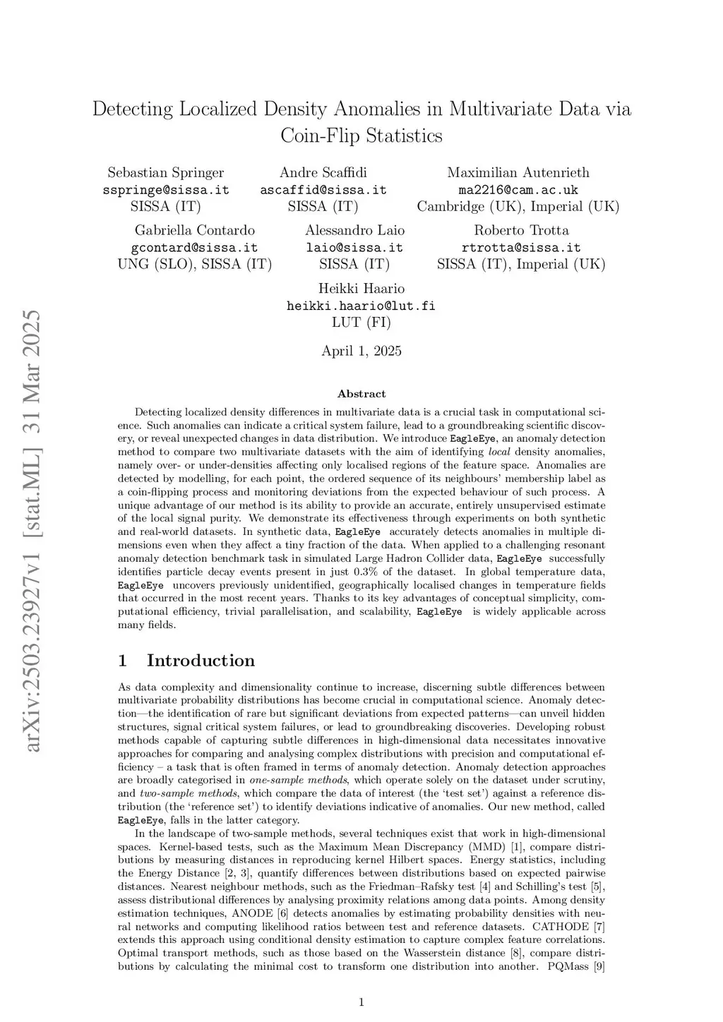Detecting localized density differences in multivariate data is a crucial task in computational science. Such anomalies can indicate a critical system failure, lead to a groundbreaking scientific discovery, or reveal unexpected changes in data distribution. We introduce EagleEye, an anomaly detection method to compare two multivariate datasets with the aim of identifying local density anomalies, namely over- or under-densities affecting only localised regions of the feature space. Anomalies are detected by modelling, for each point, the ordered sequence of its neighbours' membership label as a coin-flipping process and monitoring deviations from the expected behaviour of such process. A unique advantage of our method is its ability to provide an accurate, entirely unsupervised estimate of the local signal purity. We demonstrate its effectiveness through experiments on both synthetic and real-world datasets. In synthetic data, EagleEye accurately detects anomalies in multiple dimensions even when they affect a tiny fraction of the data. When applied to a challenging resonant anomaly detection benchmark task in simulated Large Hadron Collider data, EagleEye successfully identifies particle decay events present in just 0.3% of the dataset. In global temperature data, EagleEye uncovers previously unidentified, geographically localised changes in temperature fields that occurred in the most recent years. Thanks to its key advantages of conceptual simplicity, computational efficiency, trivial parallelisation, and scalability, EagleEye is widely applicable across many fields.