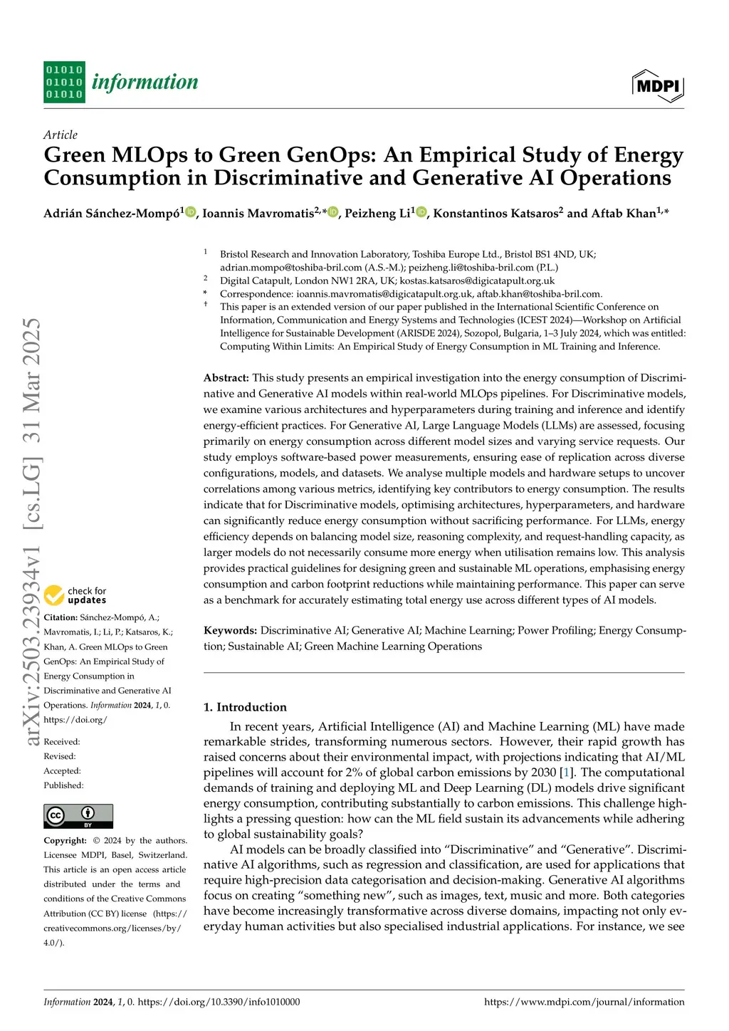 This study presents an empirical investigation into the energy consumption of Discriminative and Generative AI models within real-world MLOps pipelines. For Discriminative models, we examine various architectures and hyperparameters during training and inference and identify energy-efficient practices. For Generative AI, Large Language Models (LLMs) are assessed, focusing primarily on energy consumption across different model sizes and varying service requests. Our study employs software-based power measurements, ensuring ease of replication across diverse configurations, models, and datasets. We analyse multiple models and hardware setups to uncover correlations among various metrics, identifying key contributors to energy consumption. The results indicate that for Discriminative models, optimising architectures, hyperparameters, and hardware can significantly reduce energy consumption without sacrificing performance. For LLMs, energy efficiency depends on balancing model size, reasoning complexity, and request-handling capacity, as larger models do not necessarily consume more energy when utilisation remains low. This analysis provides practical guidelines for designing green and sustainable ML operations, emphasising energy consumption and carbon footprint reductions while maintaining performance. This paper can serve as a benchmark for accurately estimating total energy use across different types of AI models.