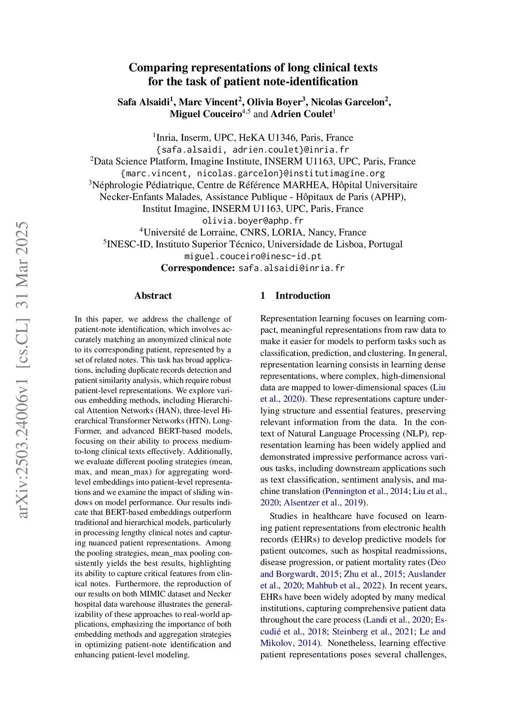 In this paper, we address the challenge of patient-note identification, which involves accurately matching an anonymized clinical note to its corresponding patient, represented by a set of related notes. This task has broad applications, including duplicate records detection and patient similarity analysis, which require robust patient-level representations. We explore various embedding methods, including Hierarchical Attention Networks (HAN), three-level Hierarchical Transformer Networks (HTN), LongFormer, and advanced BERT-based models, focusing on their ability to process mediumto-long clinical texts effectively. Additionally, we evaluate different pooling strategies (mean, max, and mean_max) for aggregating wordlevel embeddings into patient-level representations and we examine the impact of sliding windows on model performance. Our results indicate that BERT-based embeddings outperform traditional and hierarchical models, particularly in processing lengthy clinical notes and capturing nuanced patient representations. Among the pooling strategies, mean_max pooling consistently yields the best results, highlighting its ability to capture critical features from clinical notes. Furthermore, the reproduction of our results on both MIMIC dataset and Necker hospital data warehouse illustrates the generalizability of these approaches to real-world applications, emphasizing the importance of both embedding methods and aggregation strategies in optimizing patient-note identification and enhancing patient-level modeling.