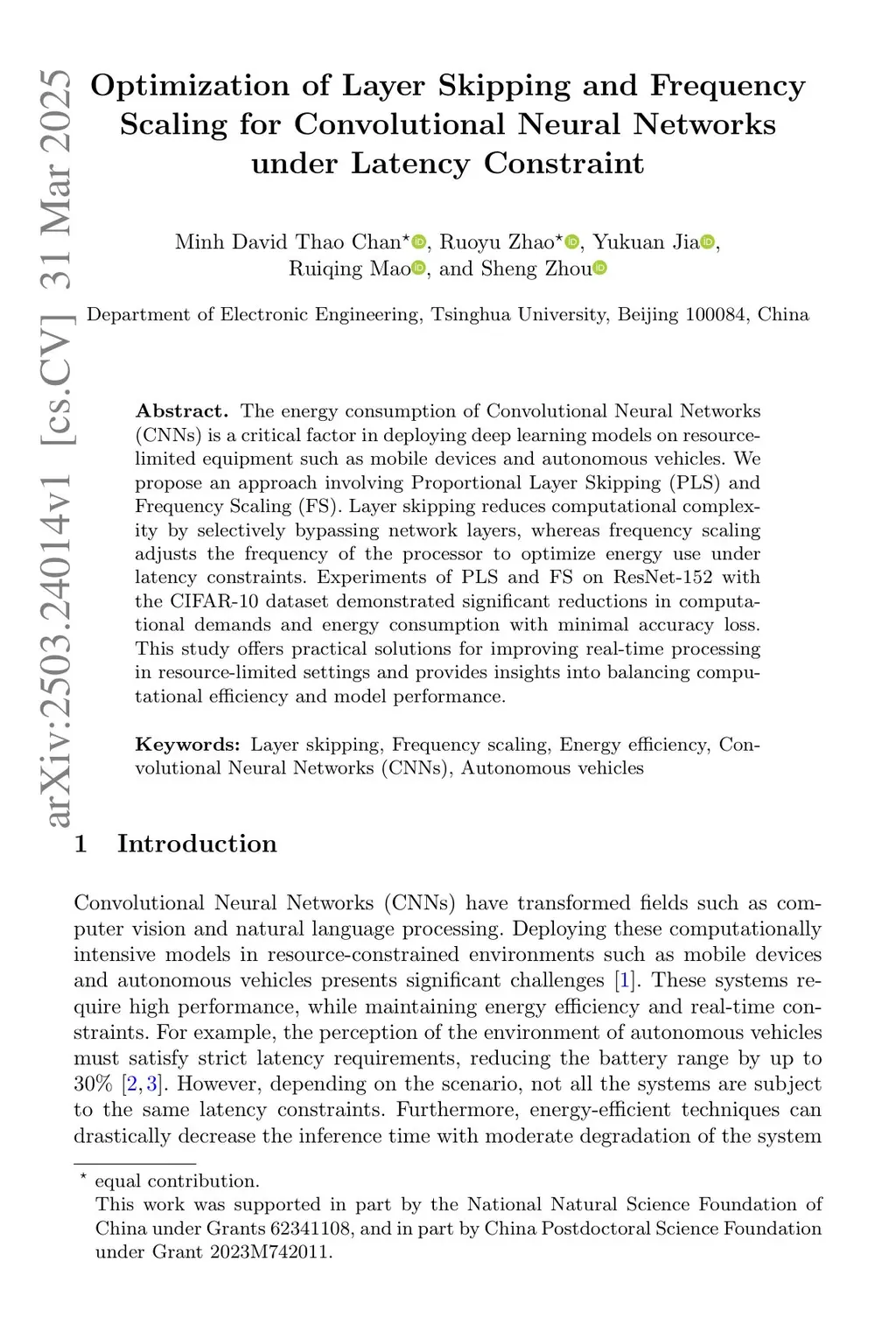 The energy consumption of Convolutional Neural Networks (CNNs) is a critical factor in deploying deep learning models on resource-limited equipment such as mobile devices and autonomous vehicles. We propose an approach involving Proportional Layer Skipping (PLS) and Frequency Scaling (FS). Layer skipping reduces computational complexity by selectively bypassing network layers, whereas frequency scaling adjusts the frequency of the processor to optimize energy use under latency constraints. Experiments of PLS and FS on ResNet-152 with the CIFAR-10 dataset demonstrated significant reductions in computational demands and energy consumption with minimal accuracy loss. This study offers practical solutions for improving real-time processing in resource-limited settings and provides insights into balancing computational efficiency and model performance.