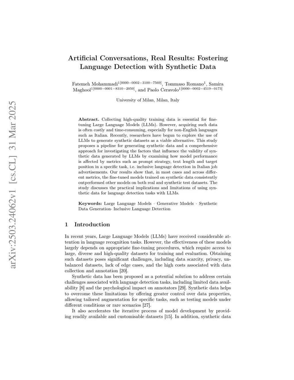 Collecting high-quality training data is essential for fine-tuning Large Language Models (LLMs). However, acquiring such data is often costly and time-consuming, especially for non-English languages such as Italian. Recently, researchers have begun to explore the use of LLMs to generate synthetic datasets as a viable alternative. This study proposes a pipeline for generating synthetic data and a comprehensive approach for investigating the factors that influence the validity of synthetic data generated by LLMs by examining how model performance is affected by metrics such as prompt strategy, text length and target position in a specific task, i.e. inclusive language detection in Italian job advertisements. Our results show that, in most cases and across different metrics, the fine-tuned models trained on synthetic data consistently outperformed other models on both real and synthetic test datasets. The study discusses the practical implications and limitations of using synthetic data for language detection tasks with LLMs.