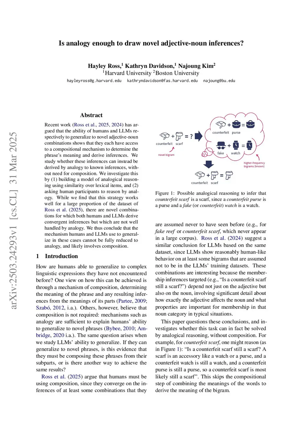 Recent work (Ross et al., 2025, 2024) has argued that the ability of humans and LLMs respectively to generalize to novel adjective-noun combinations shows that they each have access to a compositional mechanism to determine the phrase's meaning and derive inferences. We study whether these inferences can instead be derived by analogy to known inferences, without need for composition. We investigate this by (1) building a model of analogical reasoning using similarity over lexical items, and (2) asking human participants to reason by analogy. While we find that this strategy works well for a large proportion of the dataset of Ross et al. (2025), there are novel combinations for which both humans and LLMs derive convergent inferences but which are not well handled by analogy. We thus conclude that the mechanism humans and LLMs use to generalize in these cases cannot be fully reduced to analogy, and likely involves composition.