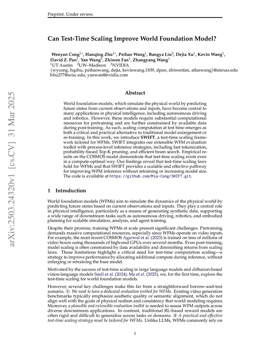 World foundation models, which simulate the physical world by predicting future states from current observations and inputs, have become central to many applications in physical intelligence, including autonomous driving and robotics. However, these models require substantial computational resources for pretraining and are further constrained by available data during post-training. As such, scaling computation at test time emerges as both a critical and practical alternative to traditional model enlargement or re-training. In this work, we introduce SWIFT, a test-time scaling framework tailored for WFMs. SWIFT integrates our extensible WFM evaluation toolkit with process-level inference strategies, including fast tokenization, probability-based Top-K pruning, and efficient beam search. Empirical results on the COSMOS model demonstrate that test-time scaling exists even in a compute-optimal way. Our findings reveal that test-time scaling laws hold for WFMs and that SWIFT provides a scalable and effective pathway for improving WFM inference without retraining or increasing model size. The code is available atthis https URL.
