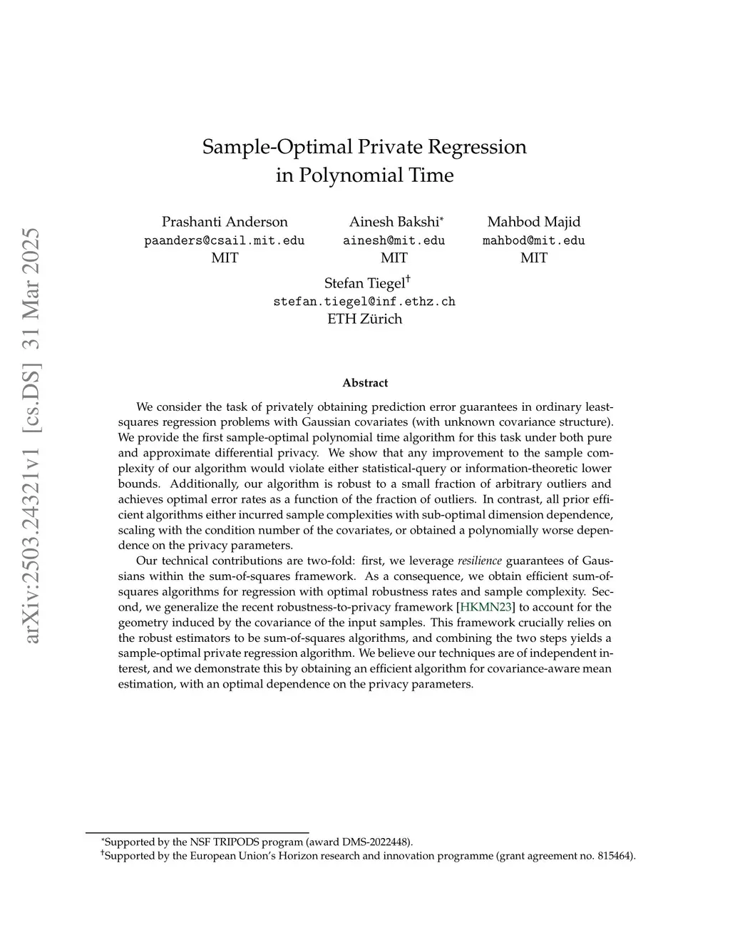 We consider the task of privately obtaining prediction error guarantees in ordinary least-squares regression problems with Gaussian covariates (with unknown covariance structure). We provide the first sample-optimal polynomial time algorithm for this task under both pure and approximate differential privacy. We show that any improvement to the sample complexity of our algorithm would violate either statistical-query or information-theoretic lower bounds. Additionally, our algorithm is robust to a small fraction of arbitrary outliers and achieves optimal error rates as a function of the fraction of outliers. In contrast, all prior efficient algorithms either incurred sample complexities with sub-optimal dimension dependence, scaling with the condition number of the covariates, or obtained a polynomially worse dependence on the privacy parameters.Our technical contributions are two-fold: first, we leverage resilience guarantees of Gaussians within the sum-of-squares framework. As a consequence, we obtain efficient sum-of-squares algorithms for regression with optimal robustness rates and sample complexity. Second, we generalize the recent robustness-to-privacy framework [HKMN23, (arXiv:2212.05015)] to account for the geometry induced by the covariance of the input samples. This framework crucially relies on the robust estimators to be sum-of-squares algorithms, and combining the two steps yields a sample-optimal private regression algorithm. We believe our techniques are of independent interest, and we demonstrate this by obtaining an efficient algorithm for covariance-aware mean estimation, with an optimal dependence on the privacy parameters.