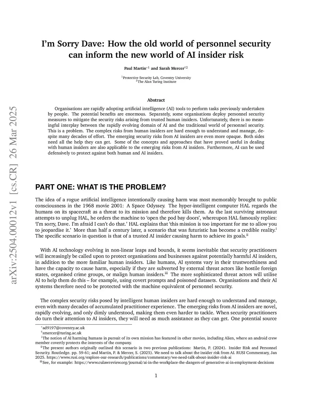 I'm Sorry Dave: How the old world of personnel security can inform the new world of AI insider risk