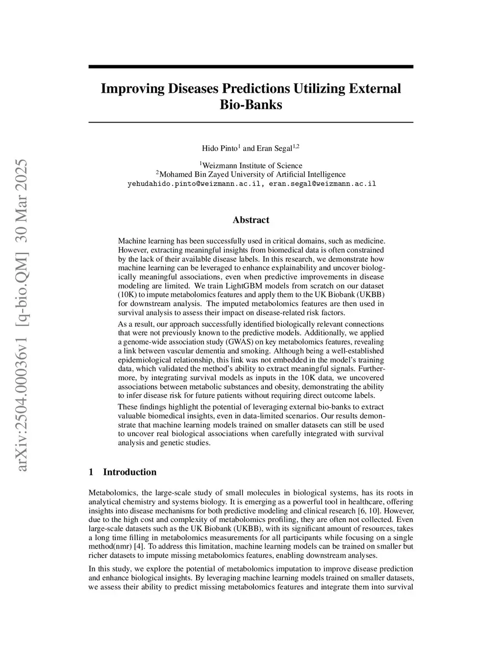 Machine learning has been successfully used in critical domains, such as medicine. However, extracting meaningful insights from biomedical data is often constrained by the lack of their available disease labels. In this research, we demonstrate how machine learning can be leveraged to enhance explainability and uncover biologically meaningful associations, even when predictive improvements in disease modeling are limited. We train LightGBM models from scratch on our dataset (10K) to impute metabolomics features and apply them to the UK Biobank (UKBB) for downstream analysis. The imputed metabolomics features are then used in survival analysis to assess their impact on disease-related risk factors. As a result, our approach successfully identified biologically relevant connections that were not previously known to the predictive models. Additionally, we applied a genome-wide association study (GWAS) on key metabolomics features, revealing a link between vascular dementia and smoking. Although being a well-established epidemiological relationship, this link was not embedded in the model's training data, which validated the method's ability to extract meaningful signals. Furthermore, by integrating survival models as inputs in the 10K data, we uncovered associations between metabolic substances and obesity, demonstrating the ability to infer disease risk for future patients without requiring direct outcome labels. These findings highlight the potential of leveraging external bio-banks to extract valuable biomedical insights, even in data-limited scenarios. Our results demonstrate that machine learning models trained on smaller datasets can still be used to uncover real biological associations when carefully integrated with survival analysis and genetic studies.