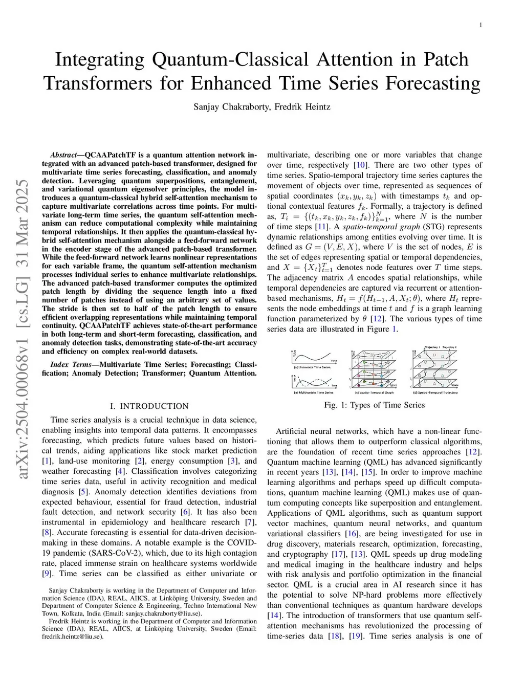 QCAAPatchTF is a quantum attention network integrated with an advanced patch-based transformer, designed for multivariate time series forecasting, classification, and anomaly detection. Leveraging quantum superpositions, entanglement, and variational quantum eigensolver principles, the model introduces a quantum-classical hybrid self-attention mechanism to capture multivariate correlations across time points. For multivariate long-term time series, the quantum self-attention mechanism can reduce computational complexity while maintaining temporal relationships. It then applies the quantum-classical hybrid self-attention mechanism alongside a feed-forward network in the encoder stage of the advanced patch-based transformer. While the feed-forward network learns nonlinear representations for each variable frame, the quantum self-attention mechanism processes individual series to enhance multivariate relationships. The advanced patch-based transformer computes the optimized patch length by dividing the sequence length into a fixed number of patches instead of using an arbitrary set of values. The stride is then set to half of the patch length to ensure efficient overlapping representations while maintaining temporal continuity. QCAAPatchTF achieves state-of-the-art performance in both long-term and short-term forecasting, classification, and anomaly detection tasks, demonstrating state-of-the-art accuracy and efficiency on complex real-world datasets.