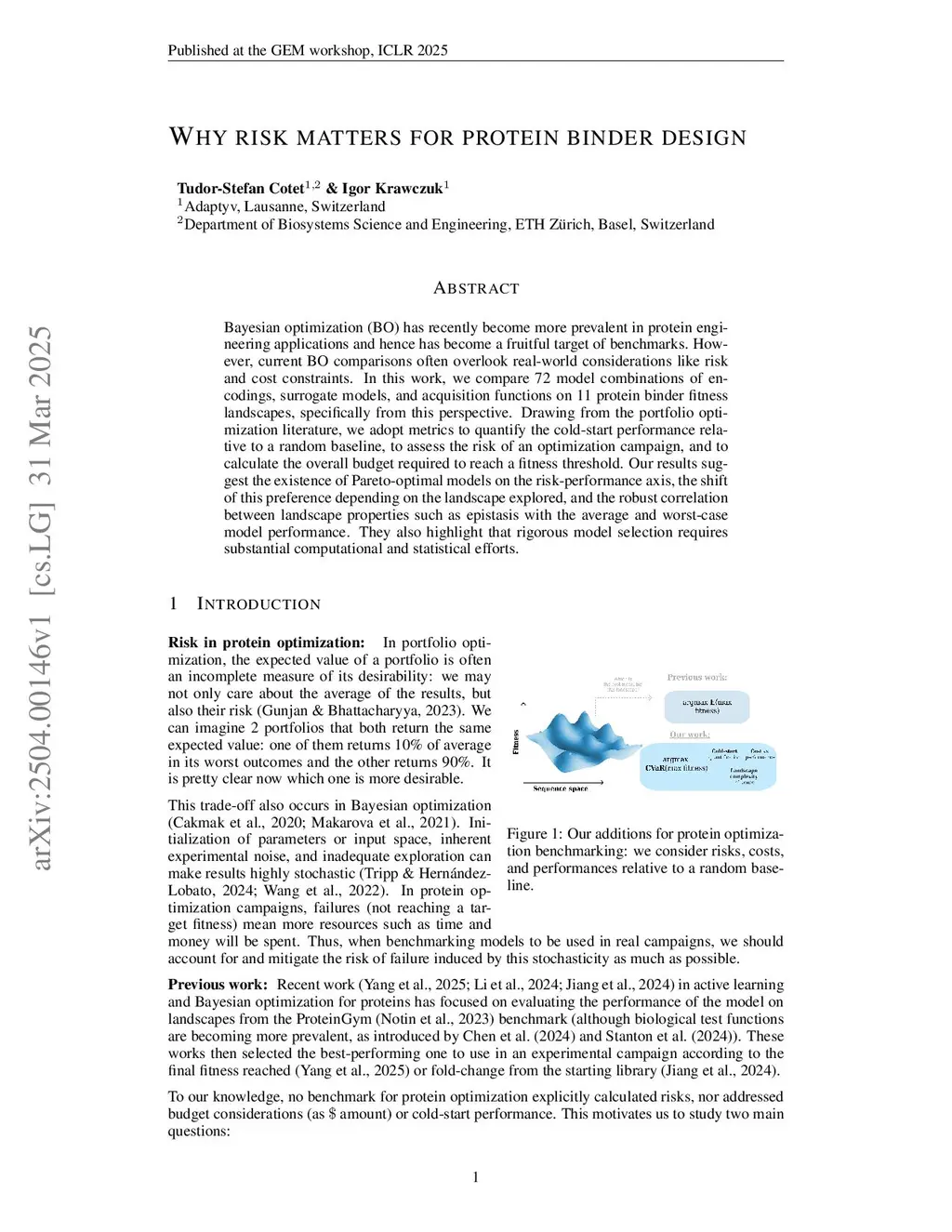 Bayesian optimization (BO) has recently become more prevalent in protein engineering applications and hence has become a fruitful target of benchmarks. However, current BO comparisons often overlook real-world considerations like risk and cost constraints. In this work, we compare 72 model combinations of encodings, surrogate models, and acquisition functions on 11 protein binder fitness landscapes, specifically from this perspective. Drawing from the portfolio optimization literature, we adopt metrics to quantify the cold-start performance relative to a random baseline, to assess the risk of an optimization campaign, and to calculate the overall budget required to reach a fitness threshold. Our results suggest the existence of Pareto-optimal models on the risk-performance axis, the shift of this preference depending on the landscape explored, and the robust correlation between landscape properties such as epistasis with the average and worst-case model performance. They also highlight that rigorous model selection requires substantial computational and statistical efforts.