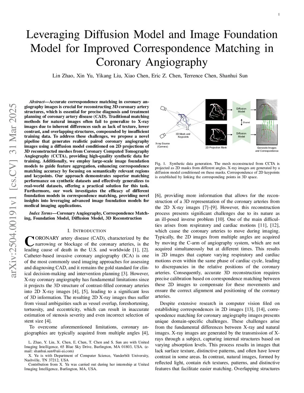 Accurate correspondence matching in coronary angiography images is crucial for reconstructing 3D coronary artery structures, which is essential for precise diagnosis and treatment planning of coronary artery disease (CAD). Traditional matching methods for natural images often fail to generalize to X-ray images due to inherent differences such as lack of texture, lower contrast, and overlapping structures, compounded by insufficient training data. To address these challenges, we propose a novel pipeline that generates realistic paired coronary angiography images using a diffusion model conditioned on 2D projections of 3D reconstructed meshes from Coronary Computed Tomography Angiography (CCTA), providing high-quality synthetic data for training. Additionally, we employ large-scale image foundation models to guide feature aggregation, enhancing correspondence matching accuracy by focusing on semantically relevant regions and keypoints. Our approach demonstrates superior matching performance on synthetic datasets and effectively generalizes to real-world datasets, offering a practical solution for this task. Furthermore, our work investigates the efficacy of different foundation models in correspondence matching, providing novel insights into leveraging advanced image foundation models for medical imaging applications.