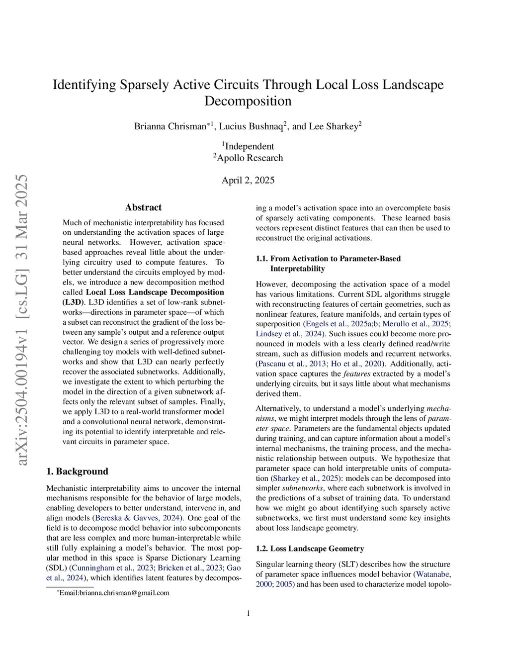 Much of mechanistic interpretability has focused on understanding the activation spaces of large neural networks. However, activation space-based approaches reveal little about the underlying circuitry used to compute features. To better understand the circuits employed by models, we introduce a new decomposition method called Local Loss Landscape Decomposition (L3D). L3D identifies a set of low-rank subnetworks: directions in parameter space of which a subset can reconstruct the gradient of the loss between any sample's output and a reference output vector. We design a series of progressively more challenging toy models with well-defined subnetworks and show that L3D can nearly perfectly recover the associated subnetworks. Additionally, we investigate the extent to which perturbing the model in the direction of a given subnetwork affects only the relevant subset of samples. Finally, we apply L3D to a real-world transformer model and a convolutional neural network, demonstrating its potential to identify interpretable and relevant circuits in parameter space.
