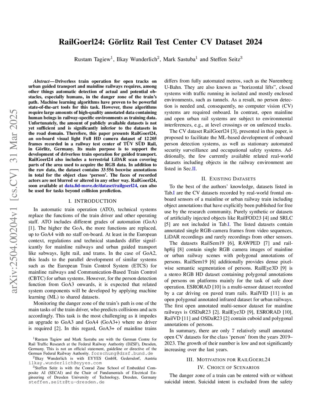 Driverless train operation for open tracks on urban guided transport and mainline railways requires, among other things automatic detection of actual and potential obstacles, especially humans, in the danger zone of the train's path. Machine learning algorithms have proven to be powerful state-of-the-art tools for this task. However, these algorithms require large amounts of high-quality annotated data containing human beings in railway-specific environments as training data. Unfortunately, the amount of publicly available datasets is not yet sufficient and is significantly inferior to the datasets in the road domain. Therefore, this paper presents RailGoerl24, an on-board visual light Full HD camera dataset of 12205 frames recorded in a railway test center of TÜV SÜD Rail, in Görlitz, Germany. Its main purpose is to support the development of driverless train operation for guided transport. RailGoerl24 also includes a terrestrial LiDAR scan covering parts of the area used to acquire the RGB data. In addition to the raw data, the dataset contains 33556 boxwise annotations in total for the object class 'person'. The faces of recorded actors are not blurred or altered in any other way. RailGoerl24, available atthis http URL, can also be used for tasks beyond collision prediction.