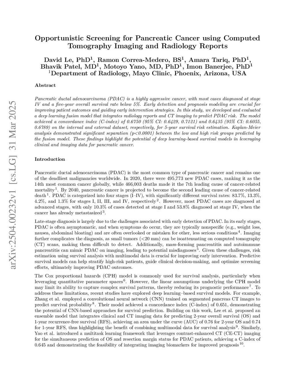 Pancreatic ductal adenocarcinoma (PDAC) is a highly aggressive cancer, with most cases diagnosed at stage IV and a five-year overall survival rate below 5%. Early detection and prognosis modeling are crucial for improving patient outcomes and guiding early intervention strategies. In this study, we developed and evaluated a deep learning fusion model that integrates radiology reports and CT imaging to predict PDAC risk. The model achieved a concordance index (C-index) of 0.6750 (95% CI: 0.6429, 0.7121) and 0.6435 (95% CI: 0.6055, 0.6789) on the internal and external dataset, respectively, for 5-year survival risk estimation. Kaplan-Meier analysis demonstrated significant separation (p<0.0001) between the low and high risk groups predicted by the fusion model. These findings highlight the potential of deep learning-based survival models in leveraging clinical and imaging data for pancreatic cancer.