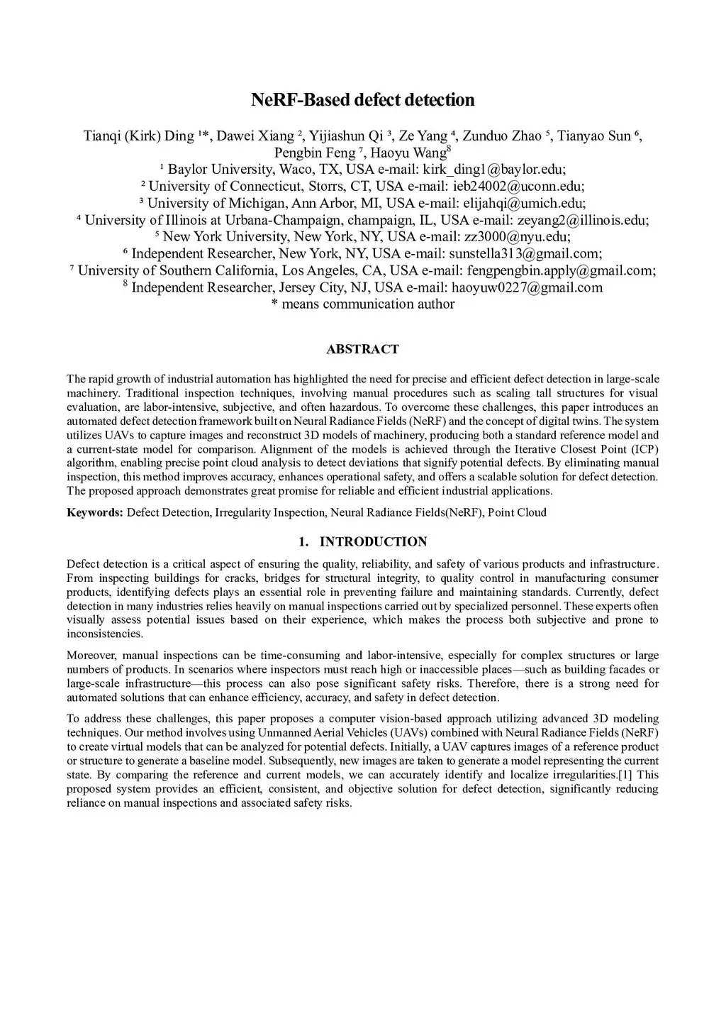 The rapid growth of industrial automation has highlighted the need for precise and efficient defect detection in large-scale machinery. Traditional inspection techniques, involving manual procedures such as scaling tall structures for visual evaluation, are labor-intensive, subjective, and often hazardous. To overcome these challenges, this paper introduces an automated defect detection framework built on Neural Radiance Fields (NeRF) and the concept of digital twins. The system utilizes UAVs to capture images and reconstruct 3D models of machinery, producing both a standard reference model and a current-state model for comparison. Alignment of the models is achieved through the Iterative Closest Point (ICP) algorithm, enabling precise point cloud analysis to detect deviations that signify potential defects. By eliminating manual inspection, this method improves accuracy, enhances operational safety, and offers a scalable solution for defect detection. The proposed approach demonstrates great promise for reliable and efficient industrial applications.