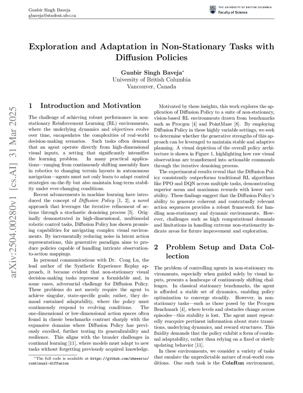 This paper investigates the application of Diffusion Policy in non-stationary, vision-based RL settings, specifically targeting environments where task dynamics and objectives evolve over time. Our work is grounded in practical challenges encountered in dynamic real-world scenarios such as robotics assembly lines and autonomous navigation, where agents must adapt control strategies from high-dimensional visual inputs. We apply Diffusion Policy -- which leverages iterative stochastic denoising to refine latent action representations-to benchmark environments including Procgen and PointMaze. Our experiments demonstrate that, despite increased computational demands, Diffusion Policy consistently outperforms standard RL methods such as PPO and DQN, achieving higher mean and maximum rewards with reduced variability. These findings underscore the approach's capability to generate coherent, contextually relevant action sequences in continuously shifting conditions, while also highlighting areas for further improvement in handling extreme non-stationarity.