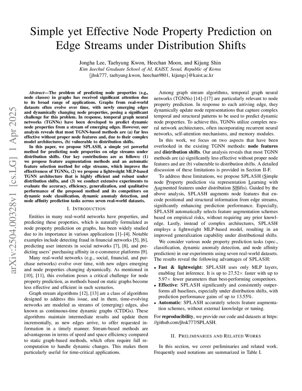The problem of predicting node properties (e.g., node classes) in graphs has received significant attention due to its broad range of applications. Graphs from real-world datasets often evolve over time, with newly emerging edges and dynamically changing node properties, posing a significant challenge for this problem. In response, temporal graph neural networks (TGNNs) have been developed to predict dynamic node properties from a stream of emerging edges. However, our analysis reveals that most TGNN-based methods are (a) far less effective without proper node features and, due to their complex model architectures, (b) vulnerable to distribution shifts. In this paper, we propose SPLASH, a simple yet powerful method for predicting node properties on edge streams under distribution shifts. Our key contributions are as follows: (1) we propose feature augmentation methods and an automatic feature selection method for edge streams, which improve the effectiveness of TGNNs, (2) we propose a lightweight MLP-based TGNN architecture that is highly efficient and robust under distribution shifts, and (3) we conduct extensive experiments to evaluate the accuracy, efficiency, generalization, and qualitative performance of the proposed method and its competitors on dynamic node classification, dynamic anomaly detection, and node affinity prediction tasks across seven real-world datasets.