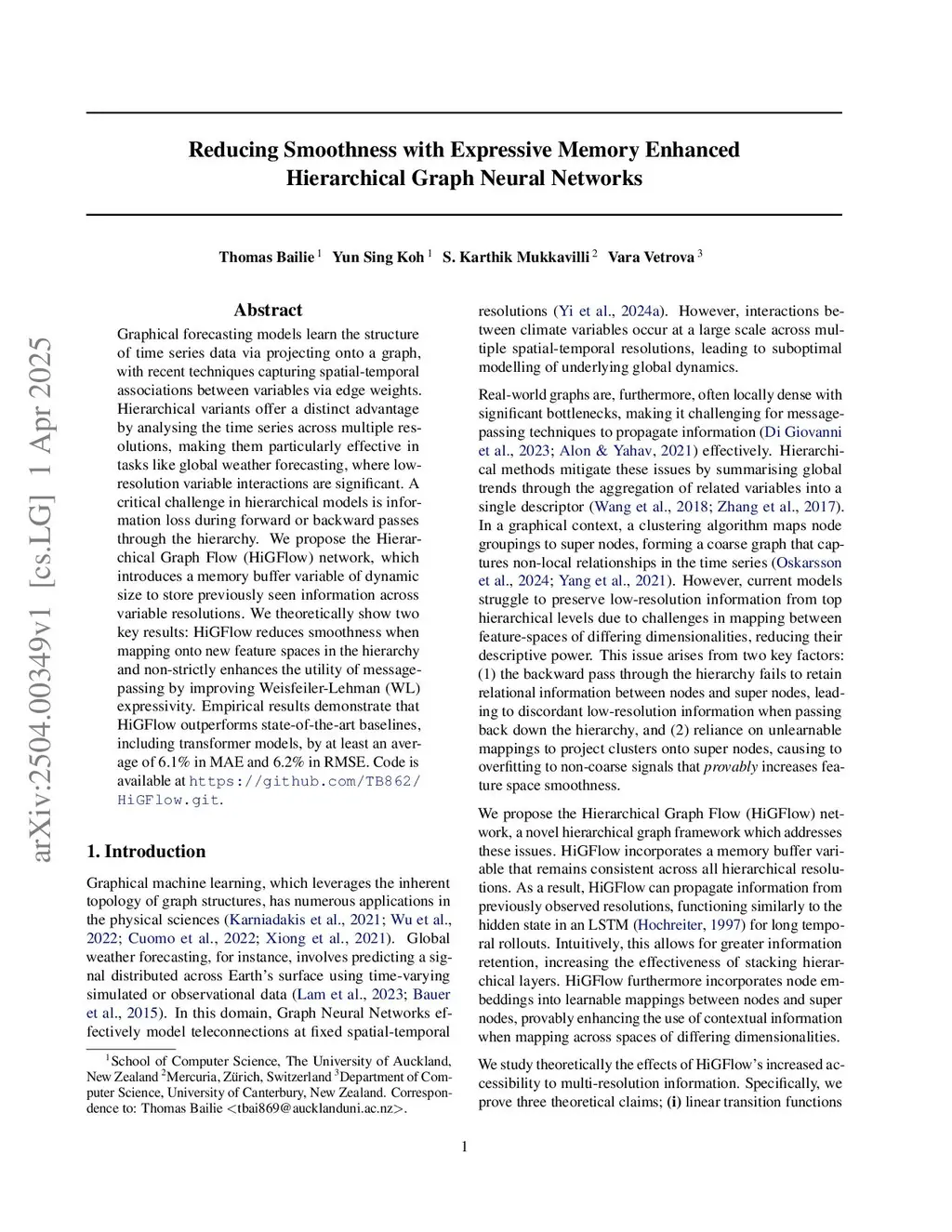 Graphical forecasting models learn the structure of time series data via projecting onto a graph, with recent techniques capturing spatial-temporal associations between variables via edge weights. Hierarchical variants offer a distinct advantage by analysing the time series across multiple resolutions, making them particularly effective in tasks like global weather forecasting, where low-resolution variable interactions are significant. A critical challenge in hierarchical models is information loss during forward or backward passes through the hierarchy. We propose the Hierarchical Graph Flow (HiGFlow) network, which introduces a memory buffer variable of dynamic size to store previously seen information across variable resolutions. We theoretically show two key results: HiGFlow reduces smoothness when mapping onto new feature spaces in the hierarchy and non-strictly enhances the utility of message-passing by improving Weisfeiler-Lehman (WL) expressivity. Empirical results demonstrate that HiGFlow outperforms state-of-the-art baselines, including transformer models, by at least an average of 6.1% in MAE and 6.2% in RMSE. Code is available atthis https URLthis http URL.