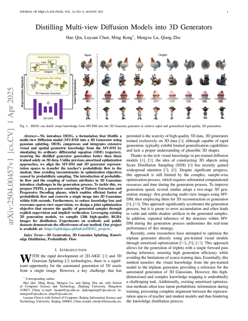We introduce DD3G, a formulation that Distills a multi-view Diffusion model (MV-DM) into a 3D Generator using gaussian splatting. DD3G compresses and integrates extensive visual and spatial geometric knowledge from the MV-DM by simulating its ordinary differential equation (ODE) trajectory, ensuring the distilled generator generalizes better than those trained solely on 3D data. Unlike previous amortized optimization approaches, we align the MV-DM and 3D generator representation spaces to transfer the teacher's probabilistic flow to the student, thus avoiding inconsistencies in optimization objectives caused by probabilistic sampling. The introduction of probabilistic flow and the coupling of various attributes in 3D Gaussians introduce challenges in the generation process. To tackle this, we propose PEPD, a generator consisting of Pattern Extraction and Progressive Decoding phases, which enables efficient fusion of probabilistic flow and converts a single image into 3D Gaussians within 0.06 seconds. Furthermore, to reduce knowledge loss and overcome sparse-view supervision, we design a joint optimization objective that ensures the quality of generated samples through explicit supervision and implicit verification. Leveraging existing 2D generation models, we compile 120k high-quality RGBA images for distillation. Experiments on synthetic and public datasets demonstrate the effectiveness of our method. Our project is available at:this https URL