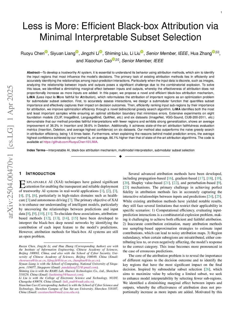 To develop a trustworthy AI system, which aim to identify the input regions that most influence the models decisions. The primary task of existing attribution methods lies in efficiently and accurately identifying the relationships among input-prediction interactions. Particularly when the input data is discrete, such as images, analyzing the relationship between inputs and outputs poses a significant challenge due to the combinatorial explosion. In this paper, we propose a novel and efficient black-box attribution mechanism, LiMA (Less input is More faithful for Attribution), which reformulates the attribution of important regions as an optimization problem for submodular subset selection. First, to accurately assess interactions, we design a submodular function that quantifies subset importance and effectively captures their impact on decision outcomes. Then, efficiently ranking input sub-regions by their importance for attribution, we improve optimization efficiency through a novel bidirectional greedy search algorithm. LiMA identifies both the most and least important samples while ensuring an optimal attribution boundary that minimizes errors. Extensive experiments on eight foundation models demonstrate that our method provides faithful interpretations with fewer regions and exhibits strong generalization, shows an average improvement of 36.3% in Insertion and 39.6% in Deletion. Our method also outperforms the naive greedy search in attribution efficiency, being 1.6 times faster. Furthermore, when explaining the reasons behind model prediction errors, the average highest confidence achieved by our method is, on average, 86.1% higher than that of state-of-the-art attribution algorithms. The code is available atthis https URL.