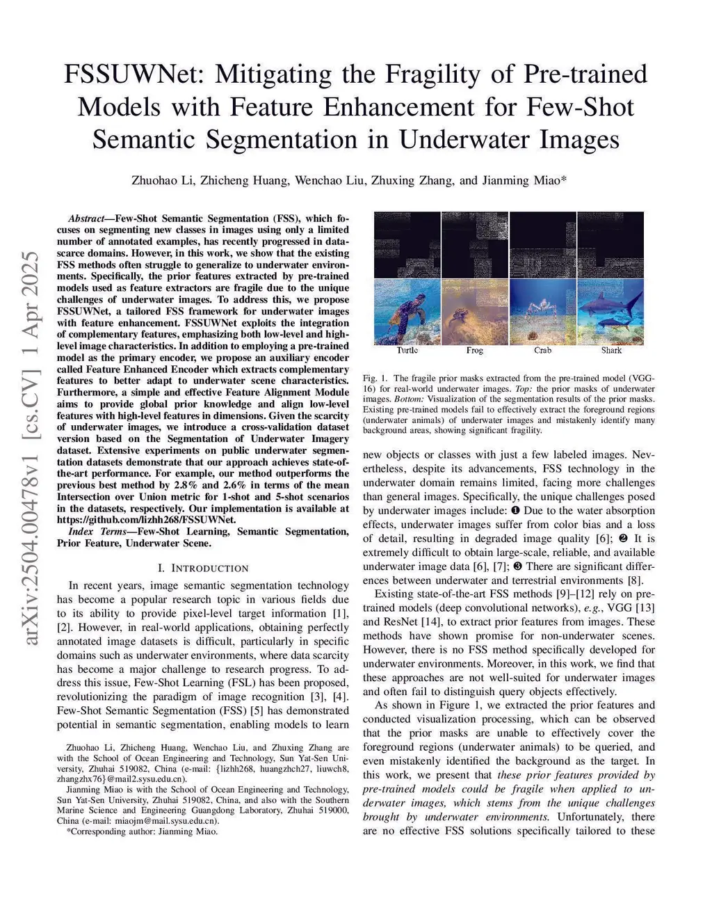 FSSUWNet: Mitigating the Fragility of Pre-trained Models with Feature Enhancement for Few-Shot Semantic Segmentation in Underwater Images