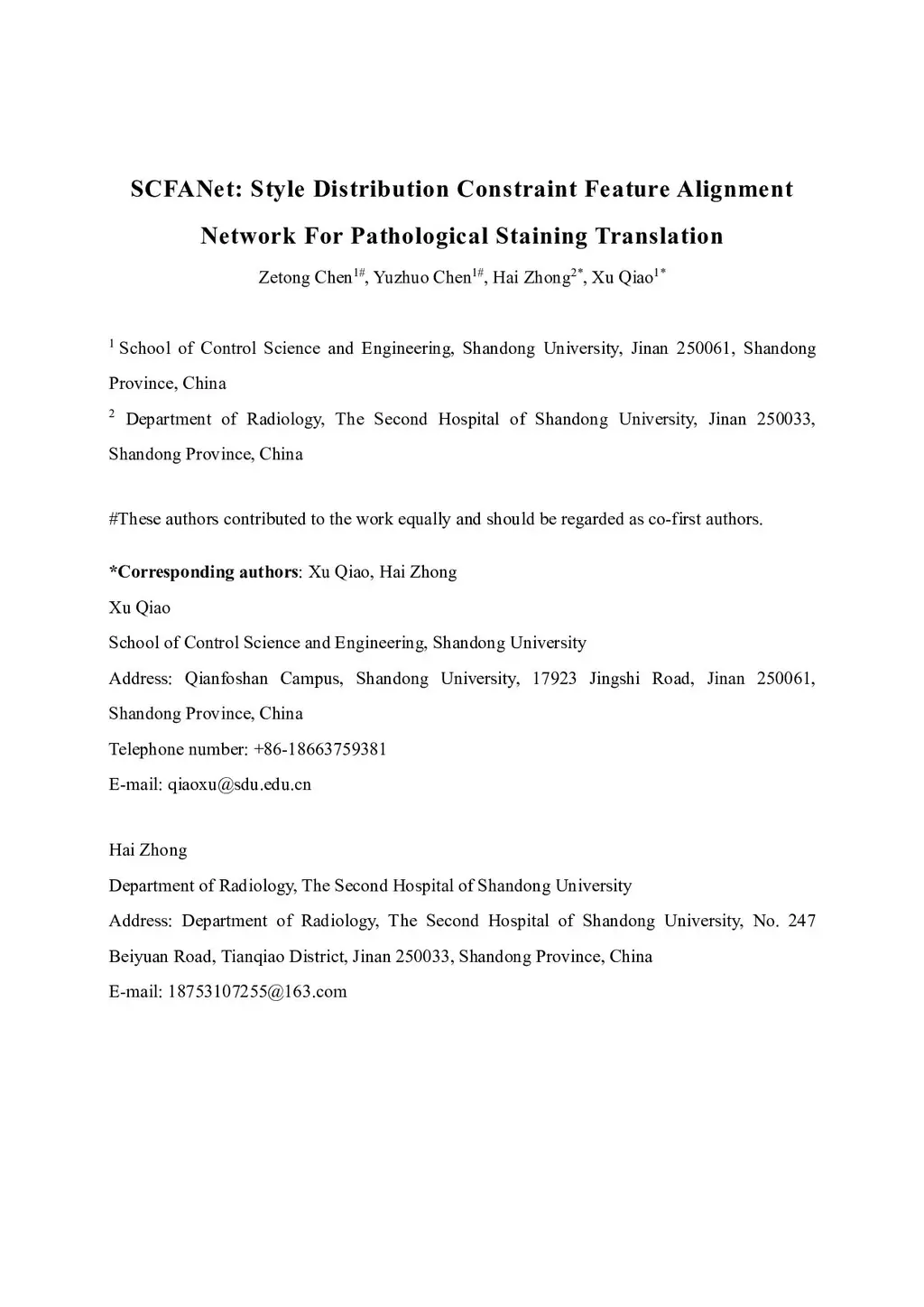 SCFANet: Style Distribution Constraint Feature Alignment Network For Pathological Staining Translation