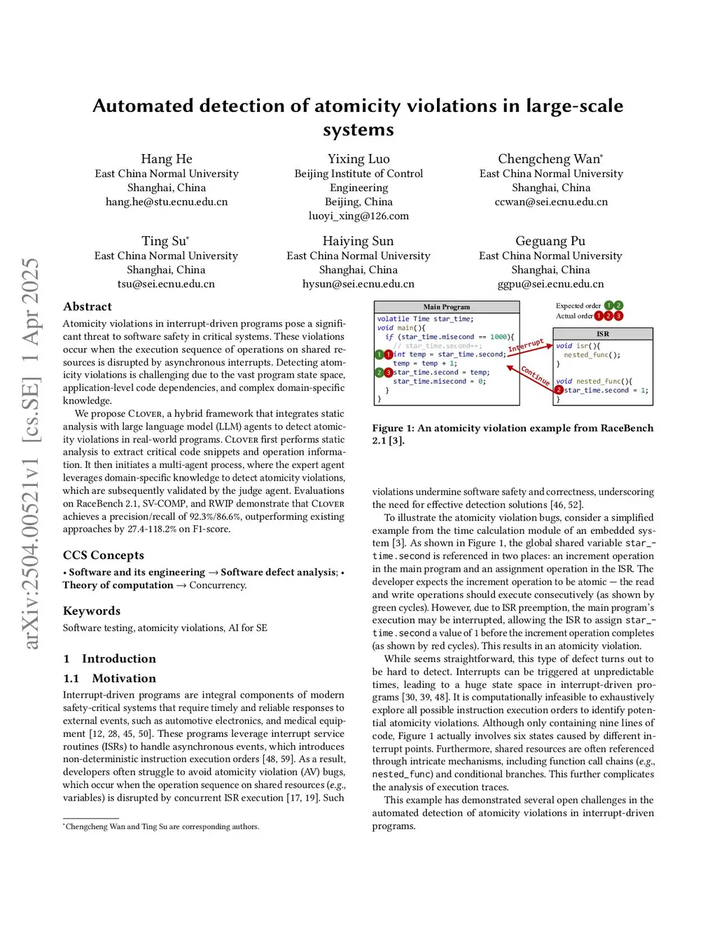 Atomicity violations in interrupt-driven programs pose a significant threat to software reliability in safety-critical systems. These violations occur when the execution sequence of operations on shared resources is disrupted by asynchronous interrupts. Detecting atomicity violations is challenging due to the vast program state space, application-level code dependencies, and complex domain-specific knowledge. In this paper, we propose CLOVER, a multi-agent framework for detecting atomicity violations in real-world interrupt-driven programs. Its plan agent orchestrates four static analysis tools to extract key information and generate code summaries. CLOVER then initializes several Expert-Judge agent pairs to detect and validate different patterns of atomicity violation, through an iterative manner. Evaluations on RaceBench, SV-COMP, and RWIP demonstrate that CLOVER achieves a precision/recall of 91.0%/96.4%, outperforming existing approaches by 33.0-117.2% on F1-score. Additionally, it identifies 12 atomicity violations in 11 real-world aerospace software projects, one of which is previously unknown.