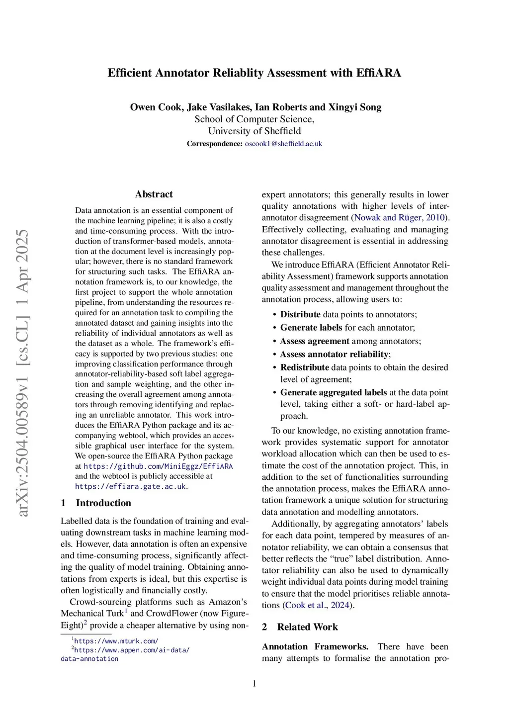Data annotation is an essential component of the machine learning pipeline; it is also a costly and time-consuming process. With the introduction of transformer-based models, annotation at the document level is increasingly popular; however, there is no standard framework for structuring such tasks. The EffiARA annotation framework is, to our knowledge, the first project to support the whole annotation pipeline, from understanding the resources required for an annotation task to compiling the annotated dataset and gaining insights into the reliability of individual annotators as well as the dataset as a whole. The framework's efficacy is supported by two previous studies: one improving classification performance through annotator-reliability-based soft-label aggregation and sample weighting, and the other increasing the overall agreement among annotators through removing identifying and replacing an unreliable annotator. This work introduces the EffiARA Python package and its accompanying webtool, which provides an accessible graphical user interface for the system. We open-source the EffiARA Python package atthis https URLand the webtool is publicly accessible atthis https URL.