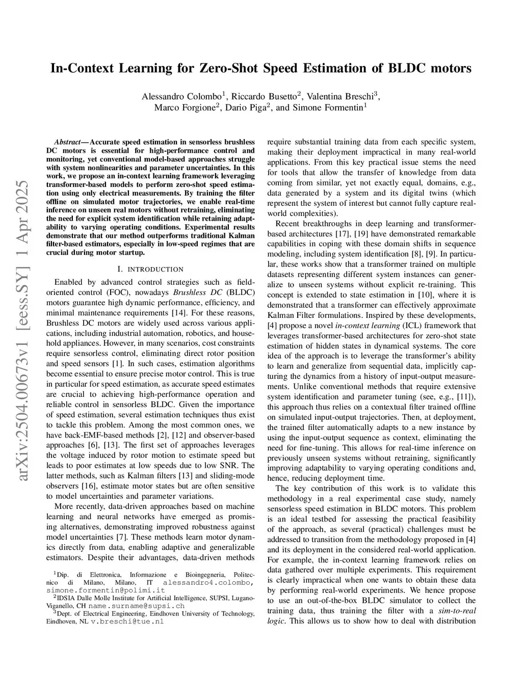 Accurate speed estimation in sensorless brushless DC motors is essential for high-performance control and monitoring, yet conventional model-based approaches struggle with system nonlinearities and parameter uncertainties. In this work, we propose an in-context learning framework leveraging transformer-based models to perform zero-shot speed estimation using only electrical measurements. By training the filter offline on simulated motor trajectories, we enable real-time inference on unseen real motors without retraining, eliminating the need for explicit system identification while retaining adaptability to varying operating conditions. Experimental results demonstrate that our method outperforms traditional Kalman filter-based estimators, especially in low-speed regimes that are crucial during motor startup.