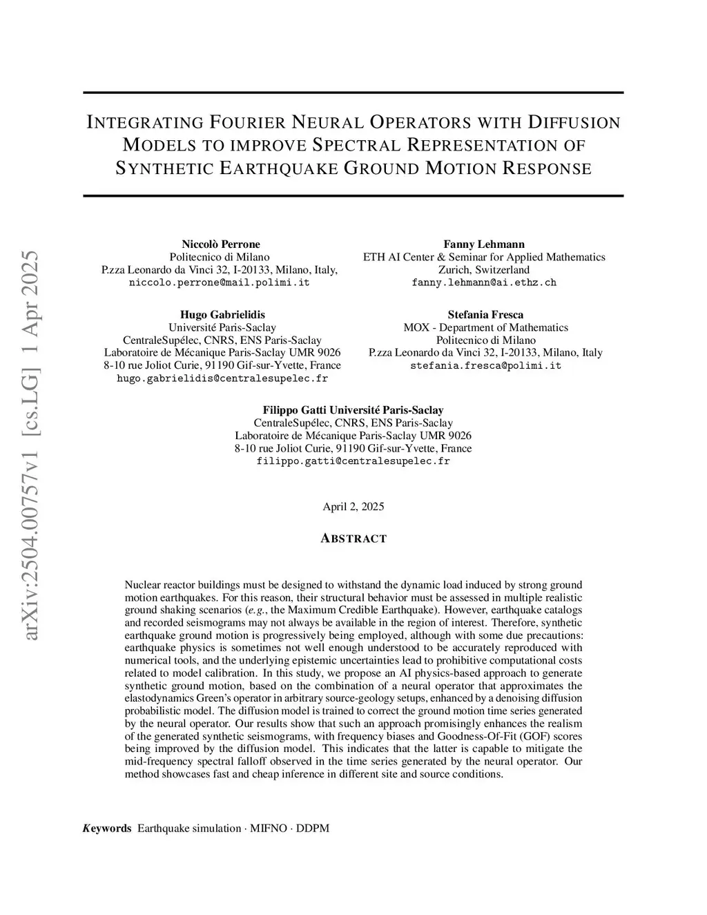 Nuclear reactor buildings must be designed to withstand the dynamic load induced by strong ground motion earthquakes. For this reason, their structural behavior must be assessed in multiple realistic ground shaking scenarios (e.g., the Maximum Credible Earthquake). However, earthquake catalogs and recorded seismograms may not always be available in the region of interest. Therefore, synthetic earthquake ground motion is progressively being employed, although with some due precautions: earthquake physics is sometimes not well enough understood to be accurately reproduced with numerical tools, and the underlying epistemic uncertainties lead to prohibitive computational costs related to model calibration. In this study, we propose an AI physics-based approach to generate synthetic ground motion, based on the combination of a neural operator that approximates the elastodynamics Green's operator in arbitrary source-geology setups, enhanced by a denoising diffusion probabilistic model. The diffusion model is trained to correct the ground motion time series generated by the neural operator. Our results show that such an approach promisingly enhances the realism of the generated synthetic seismograms, with frequency biases and Goodness-Of-Fit (GOF) scores being improved by the diffusion model. This indicates that the latter is capable to mitigate the mid-frequency spectral falloff observed in the time series generated by the neural operator. Our method showcases fast and cheap inference in different site and source conditions.