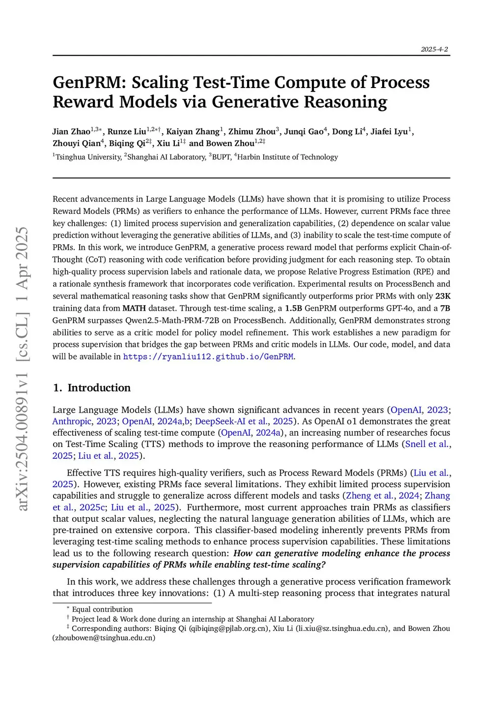 Recent advancements in Large Language Models (LLMs) have shown that it is promising to utilize Process Reward Models (PRMs) as verifiers to enhance the performance of LLMs. However, current PRMs face three key challenges: (1) limited process supervision and generalization capabilities, (2) dependence on scalar value prediction without leveraging the generative abilities of LLMs, and (3) inability to scale the test-time compute of PRMs. In this work, we introduce GenPRM, a generative process reward model that performs explicit Chain-of-Thought (CoT) reasoning with code verification before providing judgment for each reasoning step. To obtain high-quality process supervision labels and rationale data, we propose Relative Progress Estimation (RPE) and a rationale synthesis framework that incorporates code verification. Experimental results on ProcessBench and several mathematical reasoning tasks show that GenPRM significantly outperforms prior PRMs with only 23K training data from MATH dataset. Through test-time scaling, a 1.5B GenPRM outperforms GPT-4o, and a 7B GenPRM surpasses Qwen2.5-Math-PRM-72B on ProcessBench. Additionally, GenPRM demonstrates strong abilities to serve as a critic model for policy model refinement. This work establishes a new paradigm for process supervision that bridges the gap between PRMs and critic models in LLMs. Our code, model, and data will be available inthis https URL.